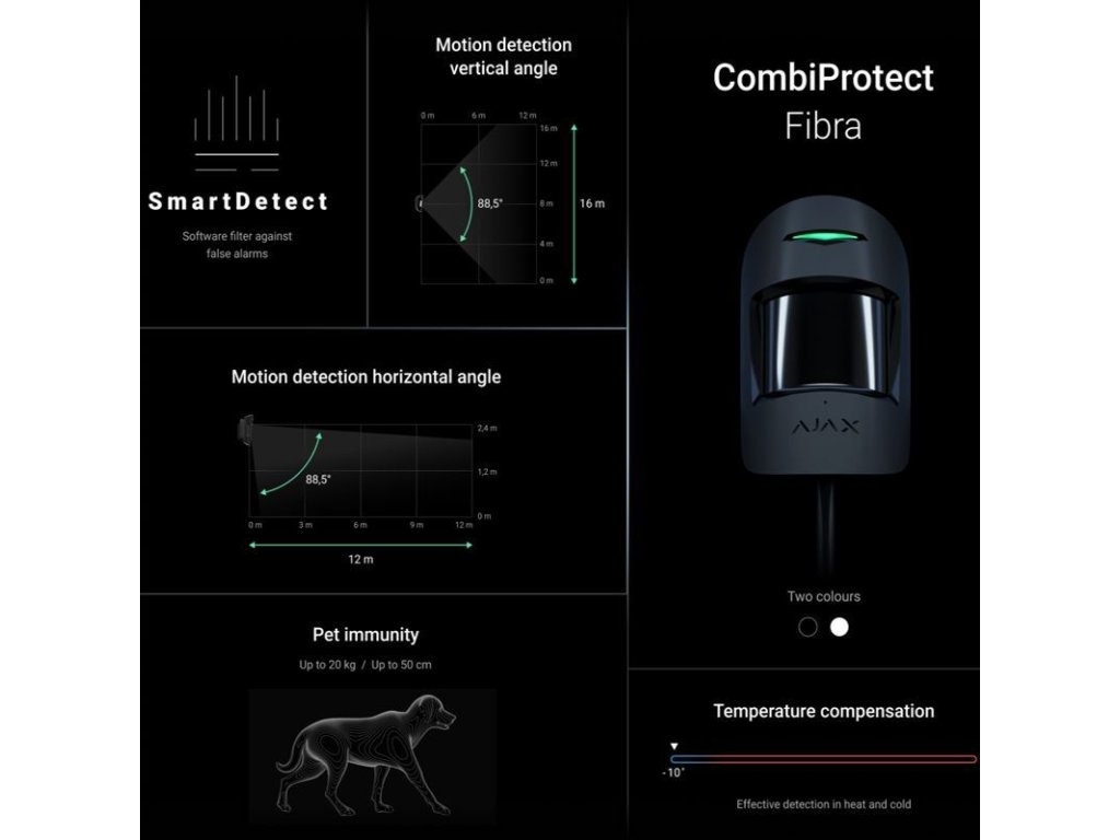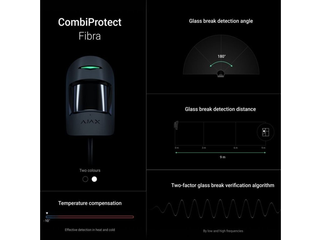 Ajax CombiProtect Fibra detekuje již první krok každého narušitele ve střeženém prostoru, přičemž spolehlivě ignoruje pohyb domácích mazlíčků, průvan a další příčiny falešných poplachů. Díky vestavěnému detektoru tříštění skla je rovněž schopen zabezpečit prosklené plochy až na vzdálenost 9 m.