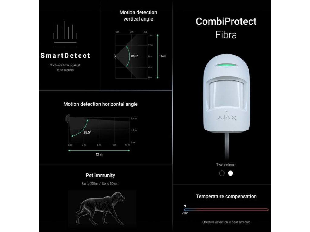 Ajax CombiProtect Fibra detekuje již první krok každého narušitele ve střeženém prostoru, přičemž spolehlivě ignoruje pohyb domácích mazlíčků, průvan a další příčiny falešných poplachů. Díky vestavěnému detektoru tříštění skla je rovněž schopen zabezpečit prosklené plochy až na vzdálenost 9 m.