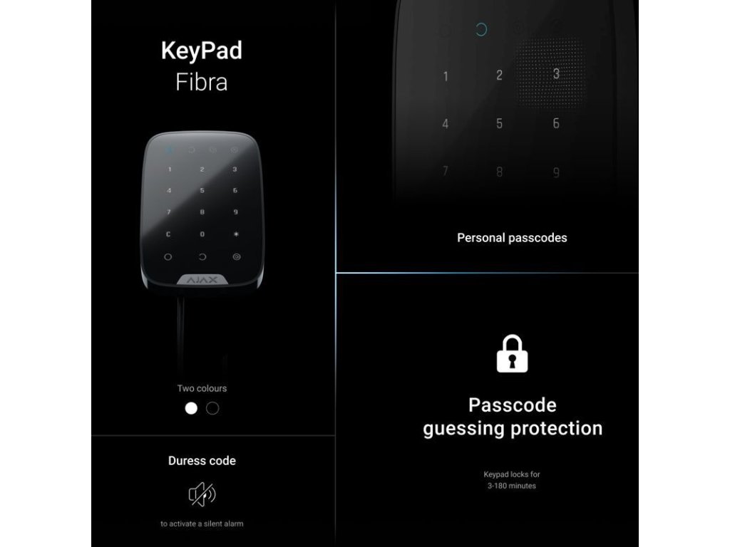 Ajax KeyPad Fibra je drátová dotyková klávesnice umožňující jednoduché ovládání zabezpečovacího systému zadáním číselného hesla či stisknutím tlačítka. V krizové situaci lze rovněž spustit tísňový poplach. Klávesnice je vybavena ochranou proti hádání hesla, která klávesnici po několika neúspěšných pokusech o zadání kódu automaticky uzamkne.