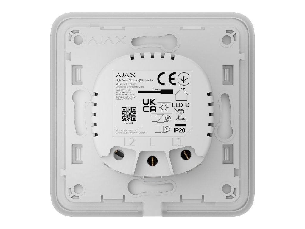 Ajax LightSwitch Dimmer Jeweller je chytrý dotykový nástěnný stmívač pro osvětlení určený pro vnitřní instalaci.