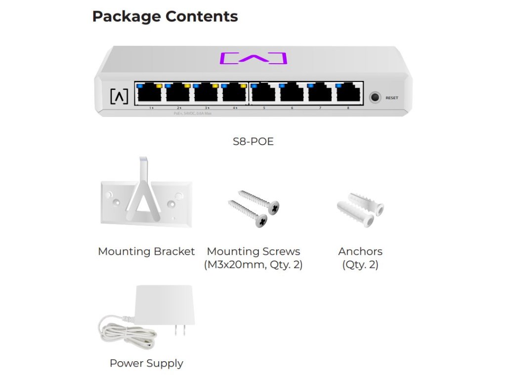 ALTA Switch 8 POESwitch nabízející 8 GbE RJ-45 portů, z nichž 4 podporují PoE+ (802.3at) s celkovým napájecím výkonem až 60 W. Přepínací kapacita dosahuje až 16 Gbps a rychlost směrování až 11,9 Mpps. Součástí balení je držák pro uchycení na stěnu.