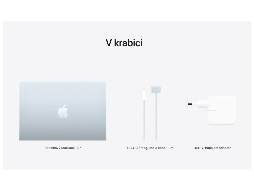 Dva porty Thunderbolt 4 podporují přenos dat až 40 Gb/s a připojení externích displejů až 6K. V balení najdete 35W dvouportový USB-C napájecí adaptér a 2m USB-C/MagSafe 3 kabel.