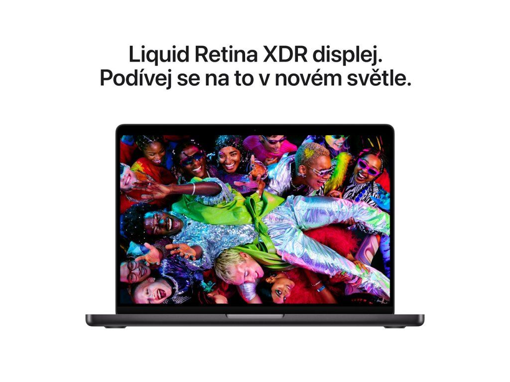 Nádherný 14,2palcový Liquid Retina XDR displej s nativním rozlišením 3024 × 1964 px nabízí kontrastní poměr 1 000 000:1, špičkový HDR jas až 1600 nitů a podporu 1 miliardy barev. Technologie ProMotion s adaptivní obnovovací frekvencí až 120 Hz zajišťuje plynulé zobrazení. Notebook vyniká výdrží baterie až 24 hodin při streamování videa a podporuje rychlonabíjení – za 30 minut dobijete až na 50 procent.