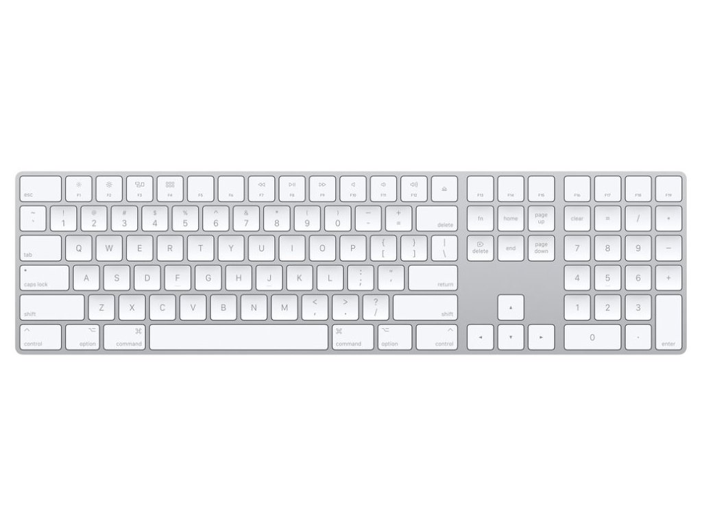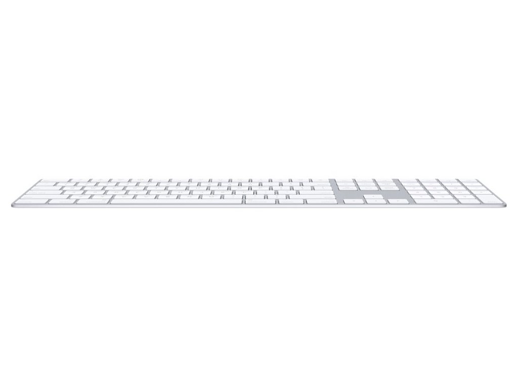 Apple Magic Keyboard s numerickou částíMagic Keyboard s číselnou klávesnicí nabízí rozšířené rozvržení včetně kláves pro rychlé posouvání v dokumentech a kláves se šipkami plné velikosti pro hraní her. Díky nůžkovému mechanismu pod každou klávesou, který zajišťuje větší stabilitu, optimalizovanému pohybu kláves a nižšímu profilu je psaní mimořádně pohodlné a přesné. Připojení k počítači je realizováno bezdrátově skrze Bluetooth či drátově skrze Lightning konektor. Zabudovaná nabíjecí baterie má neuvěřitelnou výdrž, na jedno nabití vydrží klávesnice fungovat déle než měsíc.