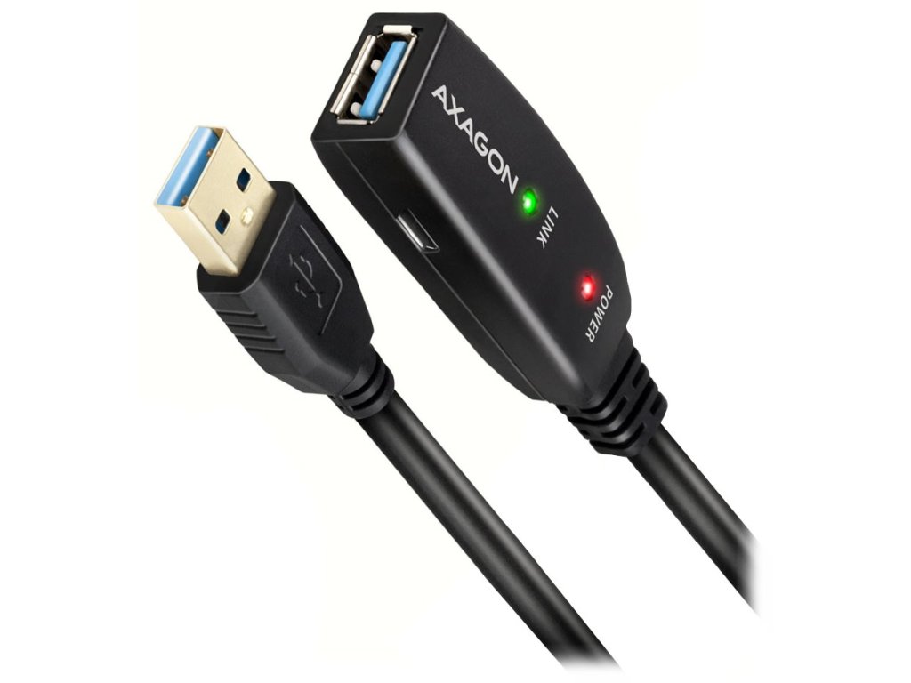 AXAGON ADR-305Aktivní prodlužovací USB 3.0 kabel zesiluje průchozí signál a umožnuje připojit výrazně vzdálenější zařízení než při použití pasivních kabelů. Kabel nevyžaduje přídavné napájení, avšak pro případ připojení zařízení s větším odběrem je k dispozici 3,5 mm konektor přídavného napájení. Samozřejmostí je možnost spojit několik kabelů za sebou.