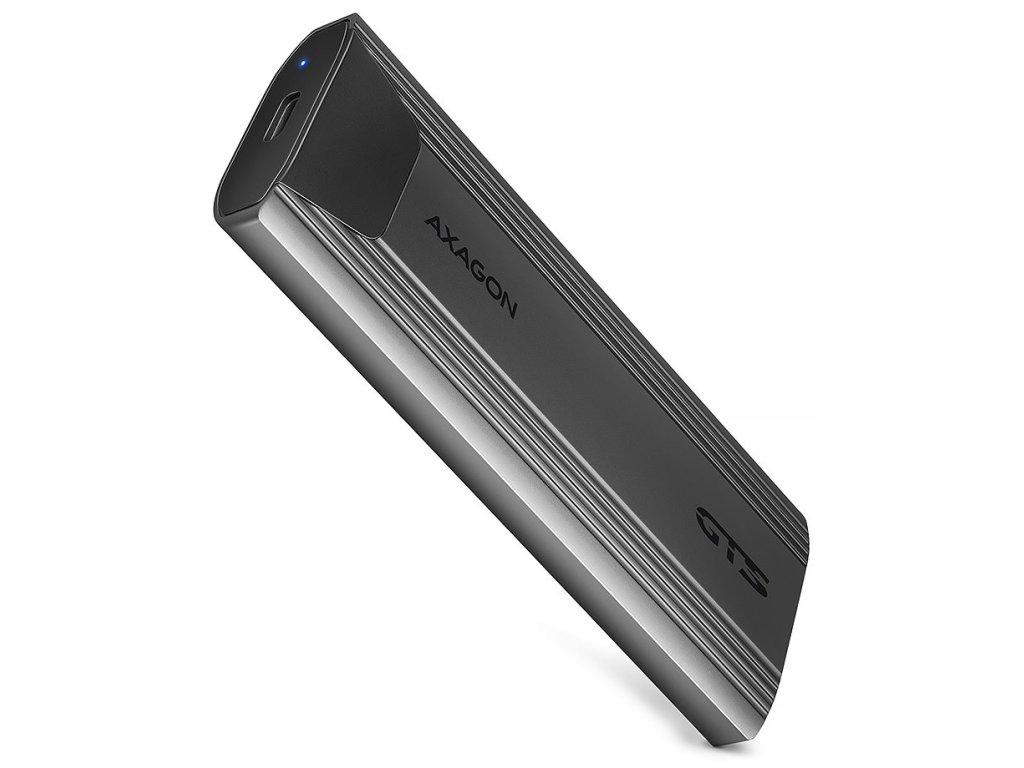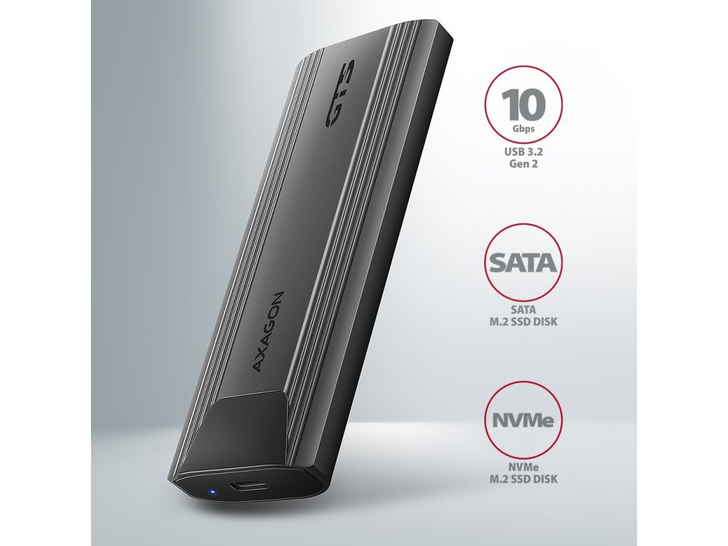 AXAGON EEM2-GTS2Univerzální externí box určený pro M.2 NVMe nebo SATA SSD disk. Díky USB-C 3.2 Gen2 rozhraní je přenosová rychlost až 10 Gb/s. Externí M.2 box podporuje i další moderní funkce např. UASP, TRIM a čtení S.M.A.R.T. informací monitorujících stav disku. Výhodou je také uchycení rovnou pro čtyři různé délky disků – 30, 42, 60 a 80 mm. M.2 karty mohou být jednostranné nebo oboustranné. Box nemá omezení kapacity vloženého SSD disku. Bezšroubkové otevírání boxu usnadňuje montáž i demontáž M.2 SSD disku. Výměna disku je rychlá a snadná a rozšiřuje tak možnosti využití boxu např. pro migraci dat, testování atd.