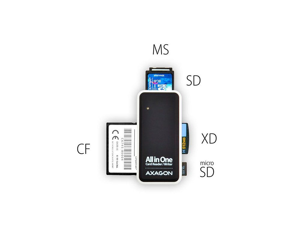AXAGON CRE-X1Kompaktní čtečka je vybavena pěti sloty a podporuje téměř všechny současné paměťové karty. Připojení je realizováno skrze rozhraní USB 2.0.