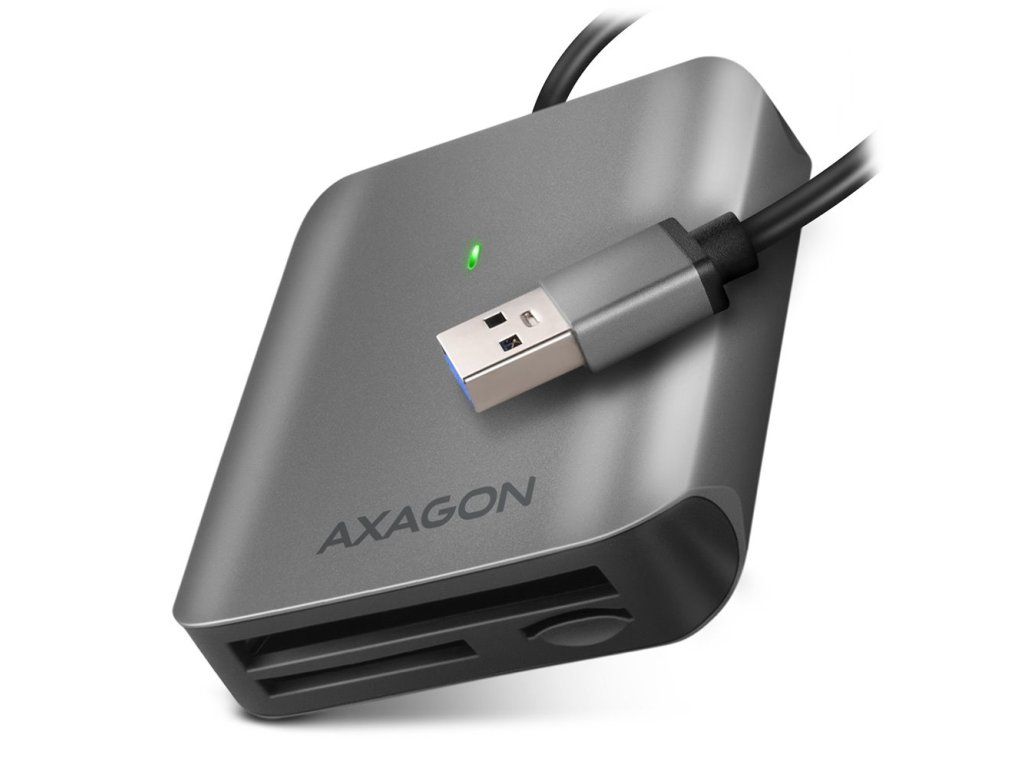 AXAGON CRE-S3Kompaktní čtečka v hliníkovém provedení je vybavena třemi sloty a podporuje téměř všechny současné paměťové karty. Samozřejmostí je možnost současné práce s kartami ve všech slotech a přímého kopírování mezi nimi. Připojení je realizováno skrze rozhraní USB 3.0.