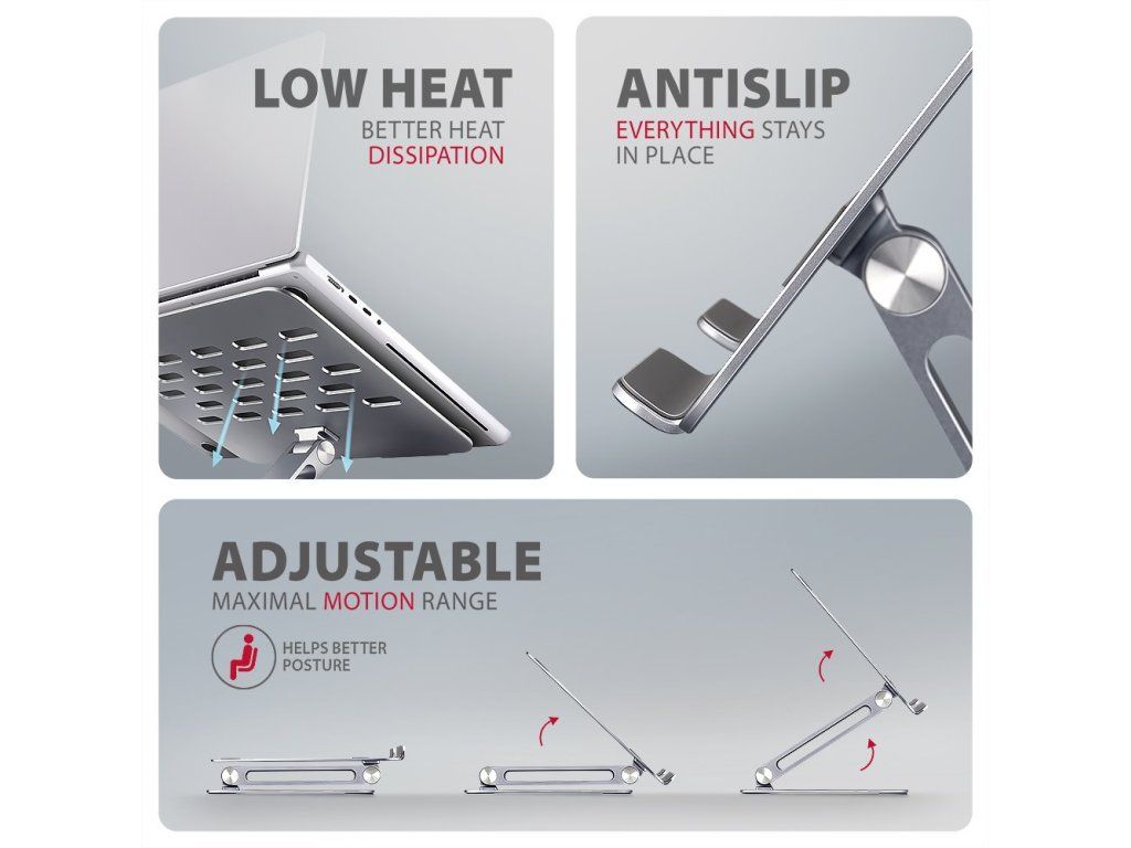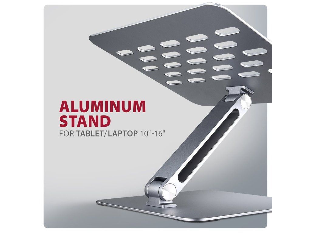 AXAGON STND-LQErgonomický stojan pro notebook či tablet o velikosti 10" až 16". Kloubový mechanismus umožňuje nastavit libovolnou kombinaci výšky a úhlu, což zlepšuje pracovní komfort a minimalizuje zatížení krční páteře. Protiskluzové prvky chrání zařízení i pracovní plochu před poškozením. Tyto pečlivě navržené vlastnosti zaručují spolu s hliníkovou konstrukcí perfektní stabilitu pro váš notebook, tablet nebo dokonce oblíbenou knihu, což vám poskytne klid a pohodlí při každodenním používání. Stojan lze snadno složit do kompaktních rozměrů pro jednoduché přenášení.