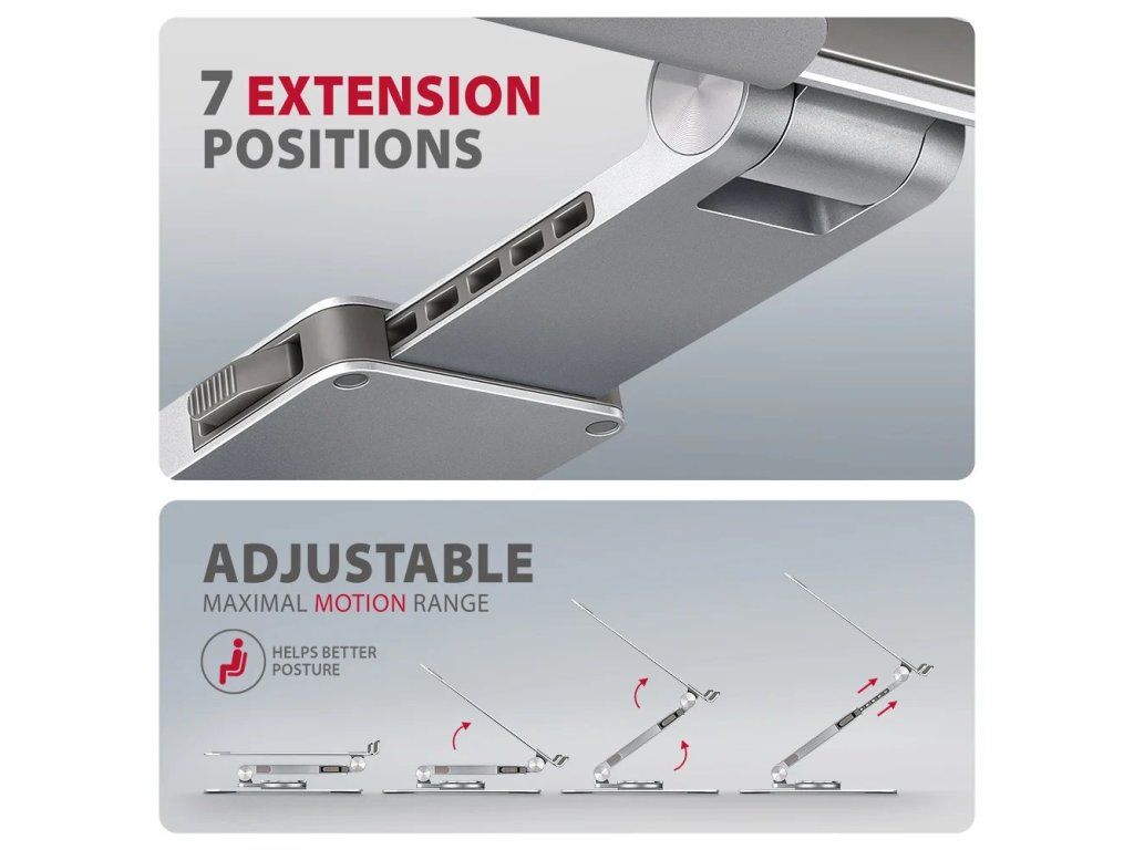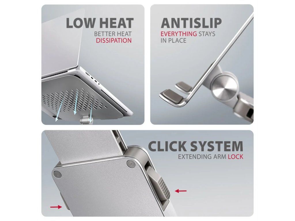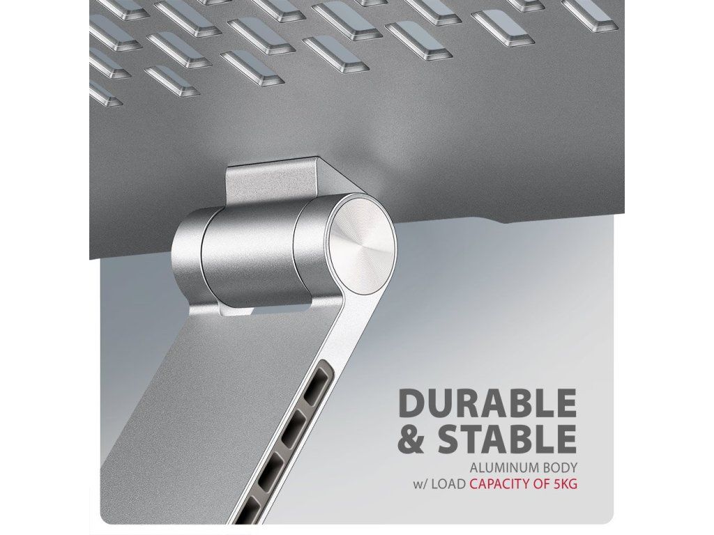 Stojan je vyroben z robustních hliníkových odlitků garantujících dlouhou životnost a stabilitu. Protiskluzová úprava chrání zařízení před poškrábáním a zajišťuje bezpečné uchycení bez nežádoucích pohybů. Větrací otvory v podložce optimalizují odvod tepla z notebooku, čímž zvyšují jeho výkon a životnost. Kompaktní design umožňuje snadné složení a přenášení kamkoli potřebujete.