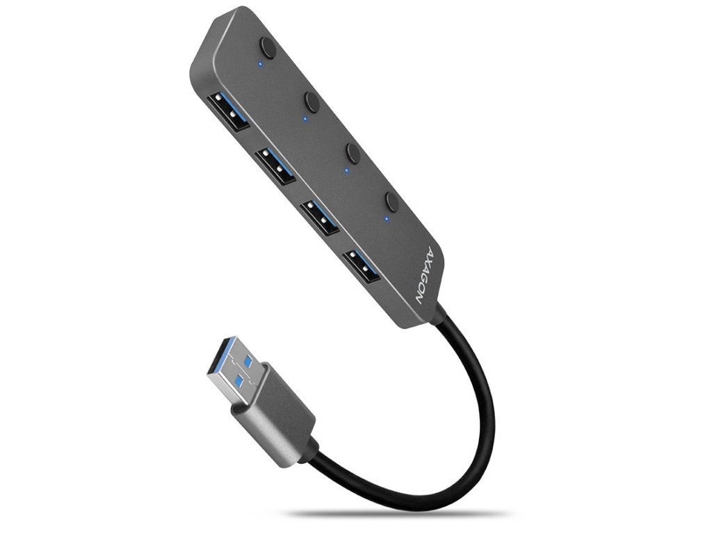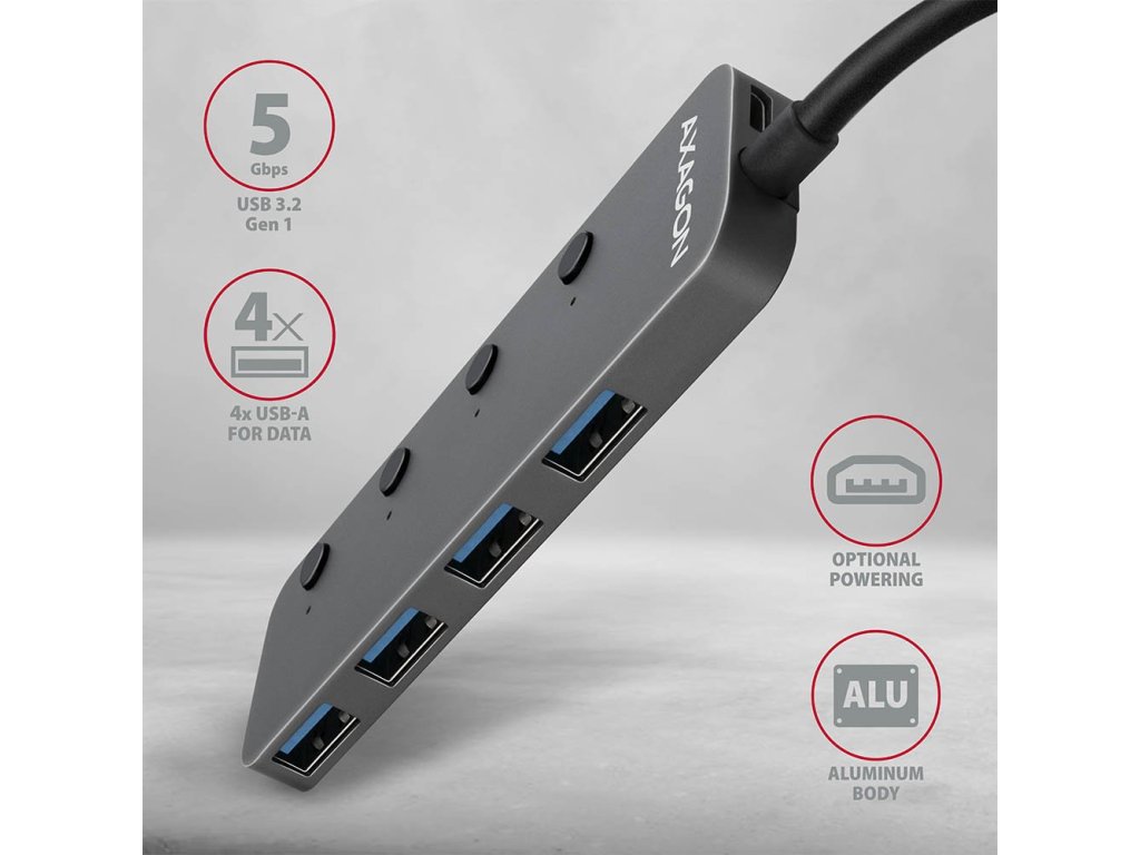 AXAGON hub USB-A s možností vypnutí konektorů / HUE-MSA / USB 3.2 Gen1 / 4x USB-A / hliníkové tělo / 0,2m