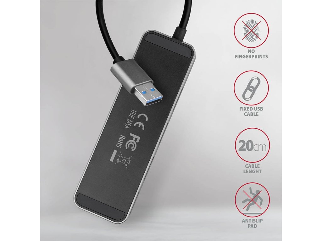 AXAGON HUE-MSARozbočovač s hliníkovým tělem připojí k počítači až čtyři USB zařízení současně. Každý port lze vypnout i zapnout pomocí tlačítka a díky tomu je možné snadno odpojovat nepoužívaná zařízení. Aktuální stav každého USB portu je indikován modrou LED. Gumové nožky zabraňují klouzání hubu po stole. Velkou výhodou je možnost externího napájení hubu z jakékoliv nabíječky mobilních zařízení s micro USB konektorem. Zvládne trvalé připojení až dvou externích disků i bez vlastního napájení. S vlastním napájením je možné připojit až tři 2,5" magnetické externí disky. Zároveň lze nabíjet smartphony, tablety, powerbanky a další zařízení proudem až 1,5 A (v závislosti na použité nabíječce).
