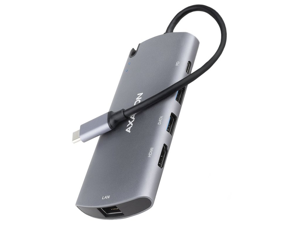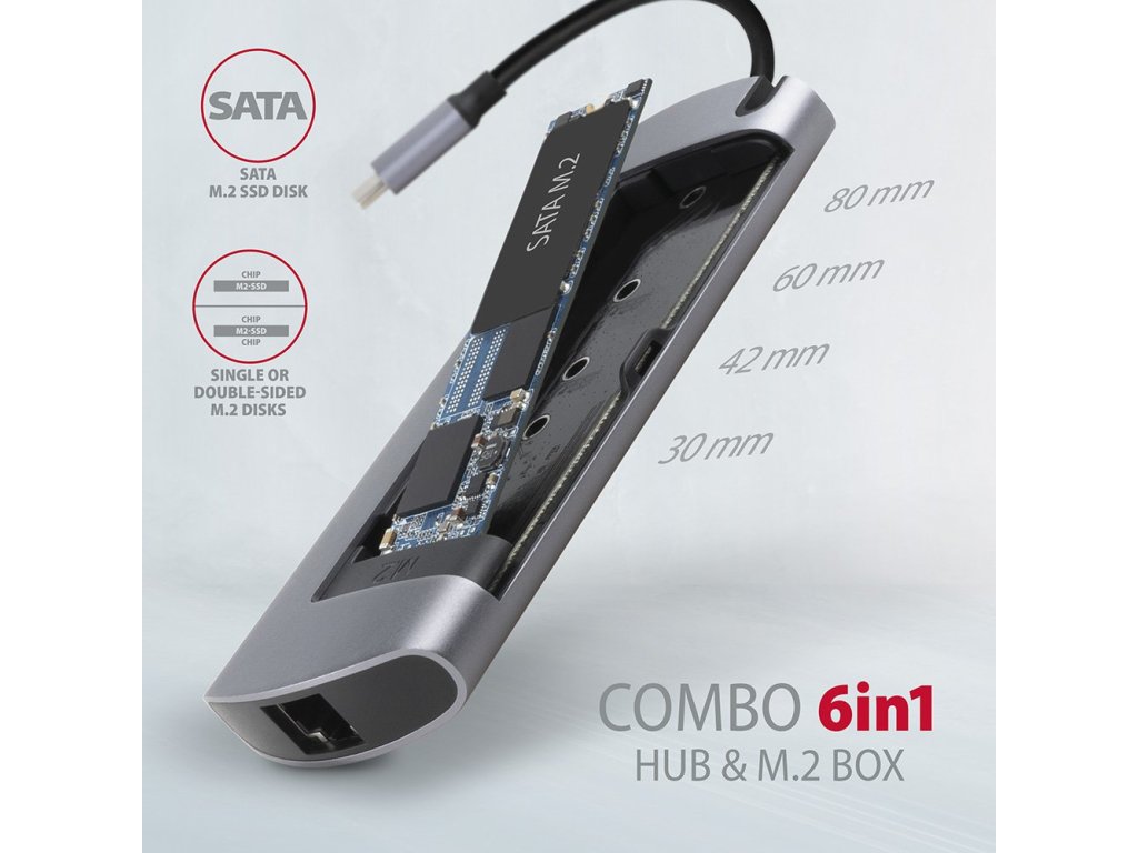 AXAGON HMC-6M2Dokovací stanice v hliníkovém provedení nabízí velké množství praktických portů. K počítači či notebooku se připojuje pomocí konektoru USB-C, který slouží k přenosu dat rychlostí až 5 Gb/s. K dokovací stanici lze skrze rozhraní HDMI připojit monitor s rozlišením až 4K při 30 Hz. Pro připojení periférií jsou přítomny dva USB 3.0 porty. Stanice taktéž nabízí USB-C Power Delivery až 100 W, který je určen pro napájení připojeného notebooku či tabletu pomocí vašeho originálního síťového adaptéru. Vysokorychlostní přístup k síti a internetu lze realizovat skrze přítomný gigabitový RJ-45 port. Uvnitř se dále nachází SATA M.2 slot pro M.2 (B / B+M key) SSD disk o velikosti 2230, 2242, 2260 či 2280. Díky tomu je možné stanici používat zároveň jako externí disk.