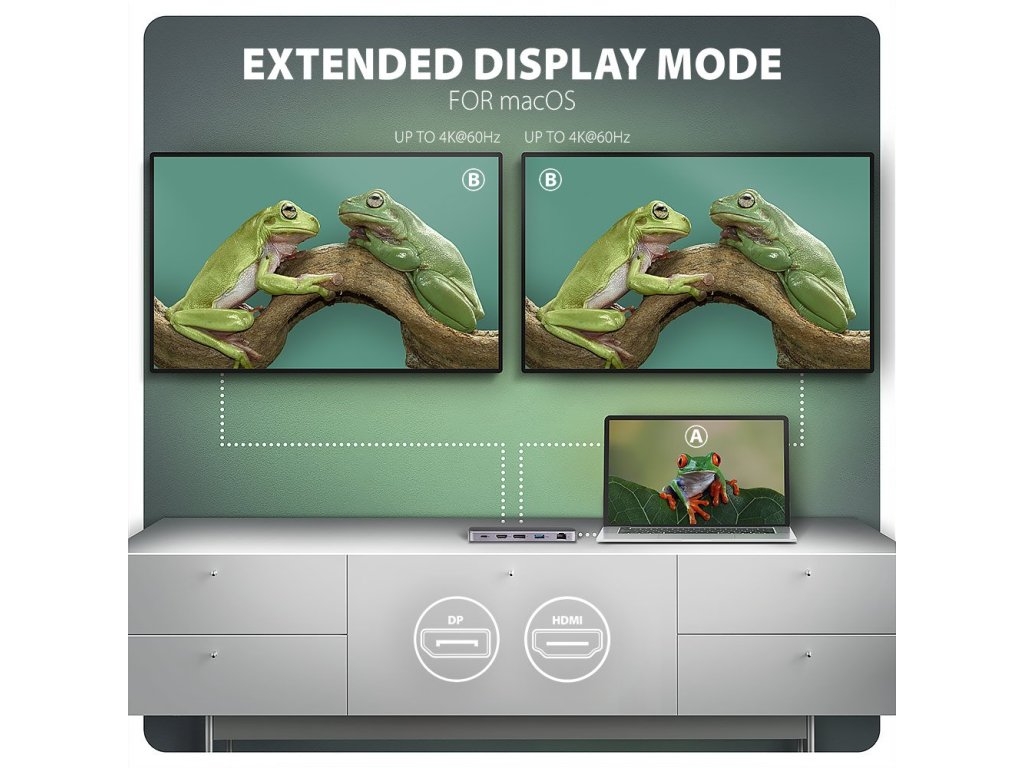 AXAGON HMC-12GM2Multiportový USB-C hub rozšíří váš notebook, počítač či telefon o 11 portů a externí slot pro M.2 disk. Nabízí dva výstupy USB 3.0 a jeden USB 3.1. K dispozici jsou také dva USB-C konektory, jeden datový s rychlostí 10 Gbps a druhý pro nabíjení telefonů nebo notebooků pomocí technologie Power Delivery 3.0 výkonem až 100 W. Hub také zvládne trvalé připojení dvou externích disků najednou. HDMI a DisplayPort výstupy s podporou HDR poskytují kvalitní obraz až do rozlišení 4K při 60 Hz, podporovány jsou také vysoké frekvence 2K při 144 Hz nebo Full HD při 240 Hz. Gigabitová síťová karta rozšíří počítač o rychlé a stabilní síťové připojení. NVME nebo SATA M.2 SSD disk lze připojit díky vestavěnému slotu na zadní straně. Čtečka karet podporuje všechny verze SD a microSD karet včetně SDXC a microSDXC s kapacitou až 2 TB. Navíc umožňuje současnou práci s kartami v obou slotech a přímé kopírování mezi nimi. Elegantní hliníkové tělo zajistí nejen mechanickou odolnost, ale i pasivní chlazení. O aktivní chlazení se postará tichý integrovaný ventilátor, který chladí jak M.2 disk tak samotné tělo hubu.