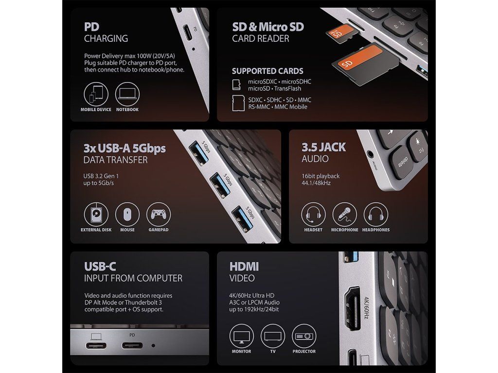 Klávesnice je osazena chiclet klávesami s nůžkovým mechanismem a 2mm zdvihem pro přesné a tiché psaní. Nabízí nastavitelné podsvícení v 5 úrovních a možnost zvětšení sklonu pro pohodlné a ergonomické užívání. HDMI výstup umožňuje připojení externího monitoru, TV nebo projektoru s rozlišením až 4K při 60 Hz, 2K při 120 Hz nebo 1080p při 200 Hz a přenos vícekanálového zvuku. Díky podpoře HDR si můžete vychutnat výrazně rozšířený rozsah barev a kontrastů bez omezení. Tři USB výstupy umožňují připojení externích disků (až 2 současně), flash disku, myši, tiskárny a dalšího příslušenství. USB porty také nabíjí mobilní telefony a tablety výkonem až 7,5 W. Čtečka paměťových karet podporuje čtení a zápis všech verzí SD a microSD karet s kapacitou až 2 TB. Navíc také umožňuje současnou práci s kartami v obou slotech a přímé kopírování mezi nimi. Zvukový výstup 3,5 mm nabízí možnost připojení stereo sluchátek, headsetu nebo aktivních reproduktorů. USB-C vstup je určen pro vhodnou Power Delivery nabíječku. Díky tomu je jak vaše mobilní zařízení, tak i hub napájen přímo z nabíječky s využitím technologie Power Delivery 3.0 s výkonem až do 100 W.