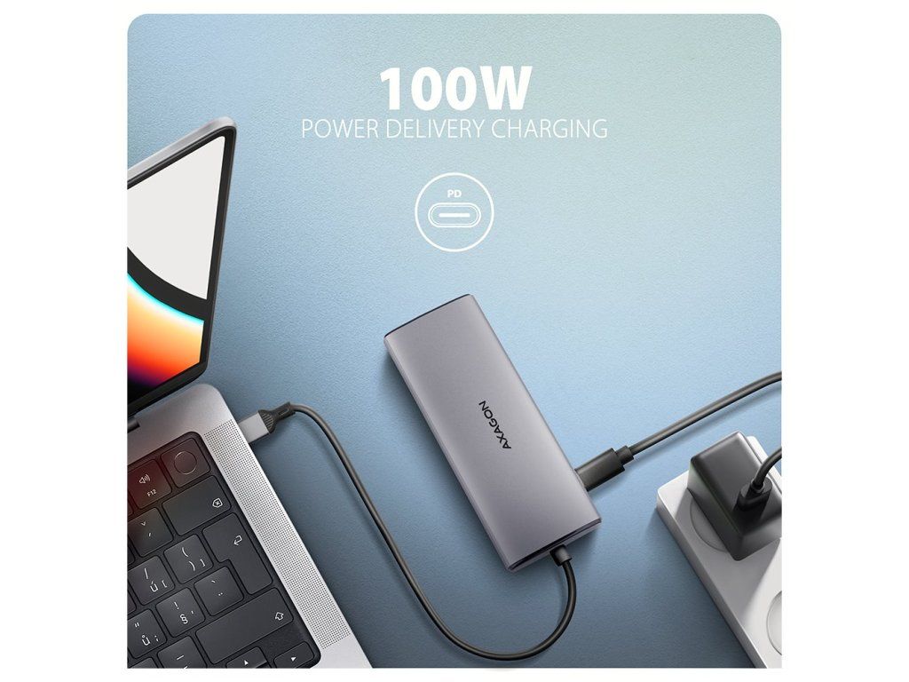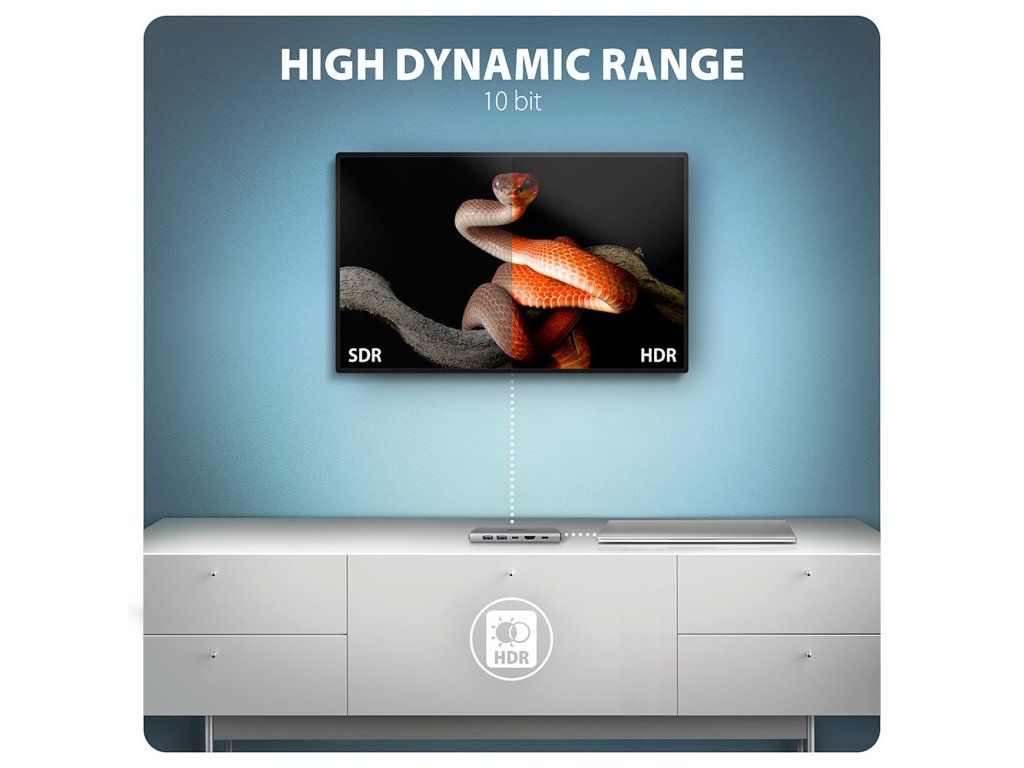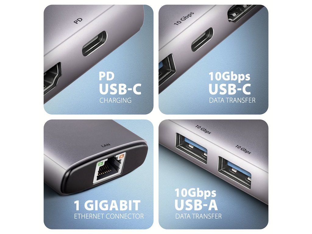 AXAGON HMC-6G2LDokovací stanice v hliníkovém provedení rozšíří váš notebook, počítač nebo telefon s USB-C rozhraním o šest portů. HDMI výstup poskytuje kvalitní obraz až do rozlišení 4K při 60 Hz a podporu HDR pro výrazně rozšířený rozsah barev a kontrastů. Podporovány jsou také vysoké frekvence 2K při 120 Hz nebo Full HD při 240 Hz. Pro připojení periférií jsou přítomny dva USB 3.1 porty a jeden USB-C port s rychlostí přenosu dat až 10 Gb/s. Druhý USB-C konektor je vyhrazen pouze pro vstup napájení, pro dobíjení připojeného zařízení pomocí technologie Power Delivery 3.0 výkonem až 100 W. Podmínkou je notebook s podporou nabíjení z USB-C portu pomocí Power Delivery a vhodná PD nabíječka. Vysokorychlostní přístup k internetu lze realizovat skrze přítomný gigabitový RJ-45 port. Elegantní hliníkové tělo zajistí nejen mechanickou odolnost, ale i pasivní chlazení. Kvalitní stíněný kabel zaručuje vysokou rychlost komunikace a minimální nežádoucí interference.