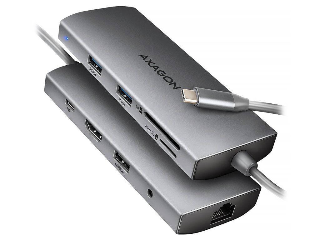 AXAGON HMC-8HLSADokovací stanice v hliníkovém provedení rozšíří váš notebook, počítač nebo telefon s USB-C rozhraním o devět portů. HDMI výstup poskytuje kvalitní obraz až do rozlišení 4K při až 60 Hz s podporou HDR pro výrazně rozšířený rozsah barev a kontrastů. Pro připojení periférií jsou přítomny dva USB 3.0 porty s rychlostí přenosu dat až 5 Gb/s a jeden USB 2.0 port. USB-C konektor je vyhrazen pouze pro napájení a současné dobíjení telefonů nebo notebooků pomocí technologie Power Delivery 3.0 výkonem až 100 W. Podmínkou je notebook s podporou nabíjení z USB-C portu pomocí Power Delivery a vhodná PD nabíječka. Vysokorychlostní přístup k internetu lze realizovat skrze přítomný gigabitový RJ-45 port. K dispozici je také čtečka SD a microSD karet s kapacitou až 2 TB, která navíc umožňuje současnou práci s kartami v obou slotech a přímé kopírování mezi nimi. Potěší taktéž přítomnost 3,5 mm jacku pro připojení sluchátek.