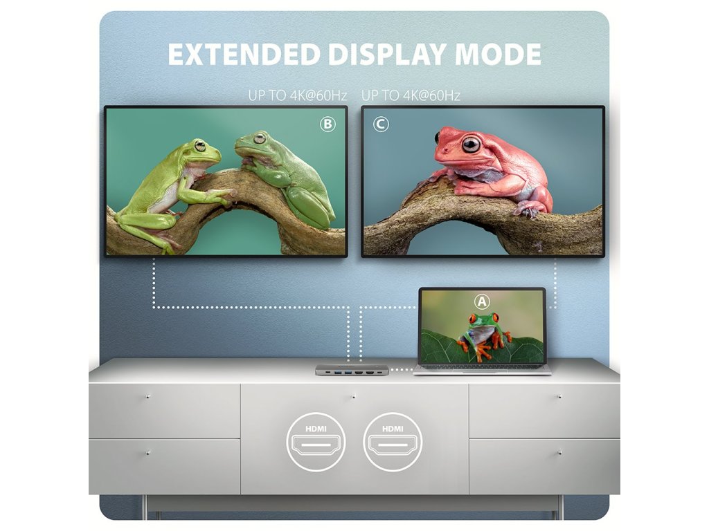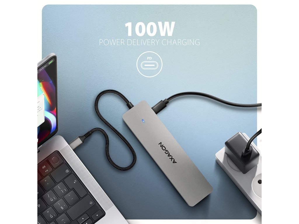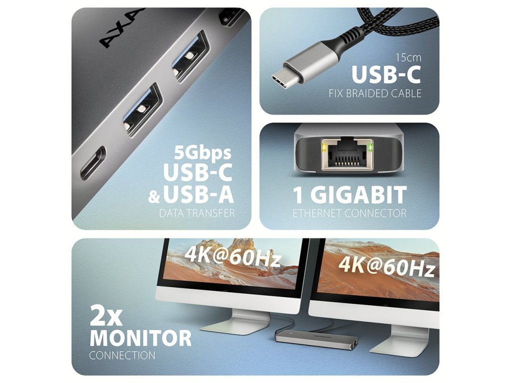 AXAGON HMC-7HX2Dokovací stanice v hliníkovém provedení rozšíří váš notebook, počítač nebo telefon s USB-C rozhraním o sedm portů. Stanice umožňuje připojit až dva 4K monitory najednou pomocí dvou HDMI portů a nabízí také podporu HDR pro výrazně rozšířený rozsah barev a kontrastů. Podporovány jsou také vysoké frekvence 2K při 120 Hz nebo Full HD při 240 Hz. Pro připojení periférií jsou přítomny dva USB 3.0 porty a jeden USB-C port s rychlostí přenosu dat až 5 Gb/s. Druhý USB-C konektor je vyhrazen pouze pro vstup napájení, pro dobíjení připojeného zařízení pomocí technologie Power Delivery 3.0 výkonem až 100 W. Podmínkou je notebook s podporou nabíjení z USB-C portu pomocí Power Delivery a vhodná PD nabíječka. Vysokorychlostní přístup k internetu lze realizovat skrze přítomný gigabitový RJ-45 port. Elegantní hliníkové tělo zajistí nejen mechanickou odolnost, ale i pasivní chlazení. Kvalitní stíněný kabel zaručuje vysokou rychlost komunikace a minimální nežádoucí interference.