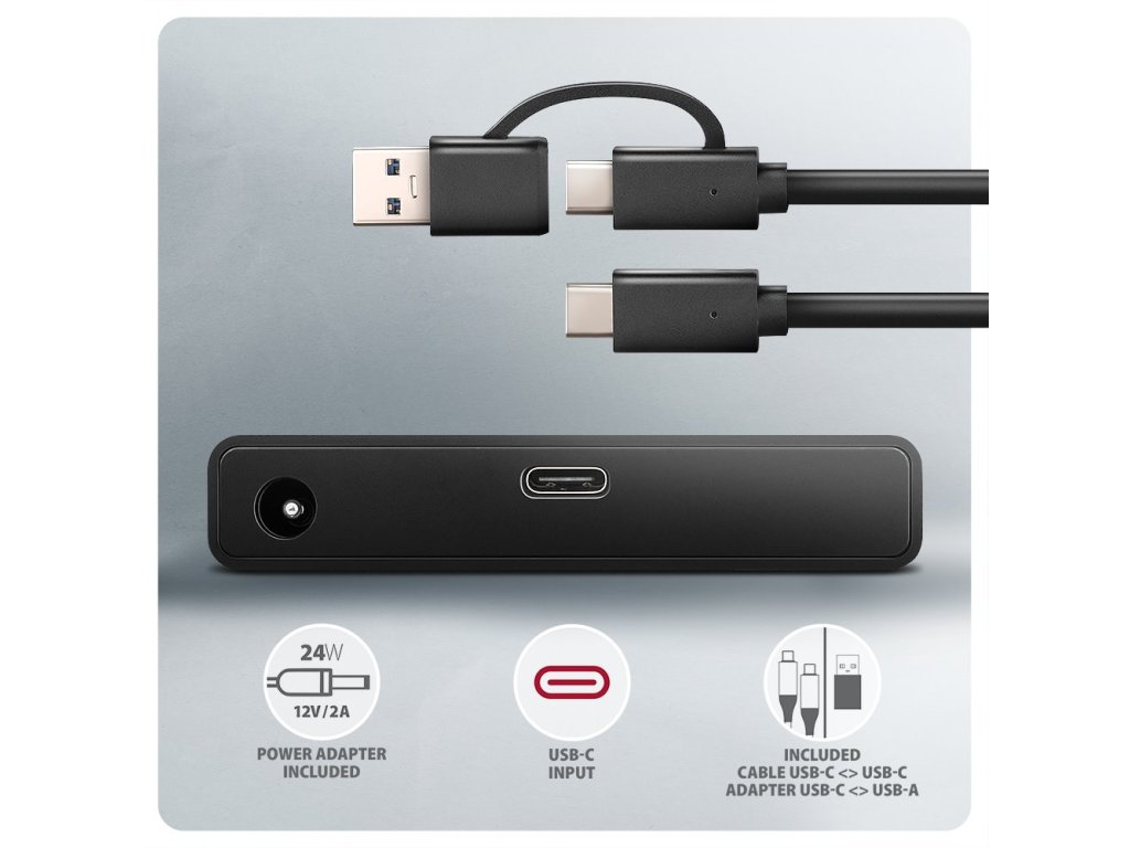 Součástí balení je kabel USB-C na USB-C a USB o délce 60 cm a napájecí adaptér 12 V/2 A (24 W) pro napájení 3,5" pevných disků.