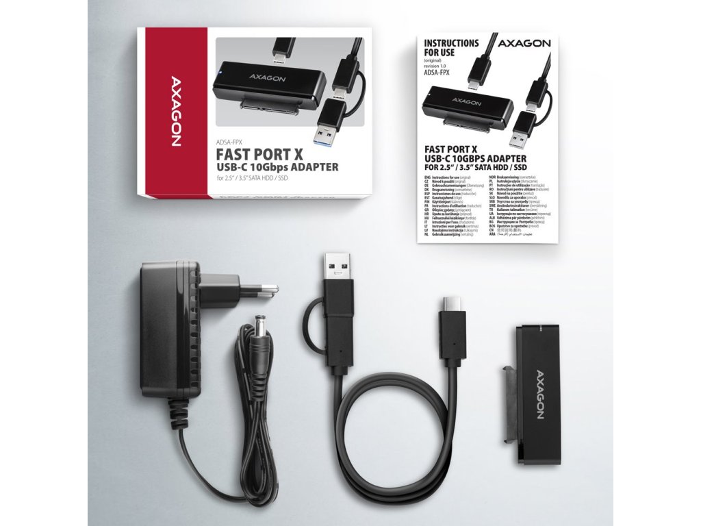 AXAGON ADSA-FPXUniverzální adaptér umožňuje propojení 2,5"/3,5" SATA pevného či SSD disku s počítačem skrze rozhraní USB-C nebo USB 3.2 Gen2, a nabízí tak přenosovou rychlost až 10 Gb/s. Podporuje všechny důležité funkce pro bezproblémovou práci s různými typy disků. Jsou to UASP pro rychlejší přenos dat, TRIM pro omezení pozvolné degradace výkonu SSD v čase, S.M.A.R.T. pro monitoring stavu disků, BOOT pro možnost bootování z disků připojených k redukci, Auto Spindown pro automatické uspání disků při delší nečinnosti, Turn Off pro vypnutí disků po odebrání zařízení nebo uspání PC a USB Bus Power pro napájení adaptéru včetně připojených 2,5" disků z USB sběrnice. Štíhlý a kompaktní adaptér umožňuje snadnou a rychlou výměnu disku bez potřeby montáže, což z něj činí ideálního pomocníka pro zálohování, migraci, přenos, ukládání a obnovu dat, testování disků apod.