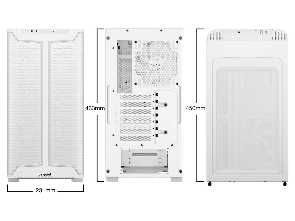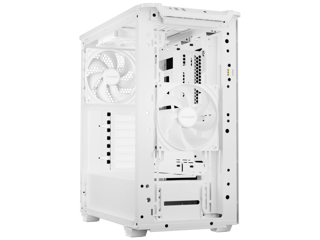 Be quiet! PURE BASE 501DXSkříň s průhlednou bočnicí a ARGB LED osvětlením nabízí dvě 3,5" pozice pro pevné disky a pět 2,5" pozic pro SSD disky. Na horním panelu naleznete dva porty USB 3.0, jeden port USB-C a dále také konektor pro sluchátka a konektor pro mikrofon. Skříň je osazena třemi ventilátory Pure Wings 3 o velikosti 140 mm. Důmyslné řešení umožňuje pohodlné umístění až 360 mm dlouhého výměníku vodního chlazení na přední straně. Ve skříni je dostatek prostoru pro chladič CPU do výšky až 190 mm a grafickou kartu o délce až 369 mm. Skříň je dodávána bez zdroje. Potěší také přítomnost odnímatelných prachových filtrů.
