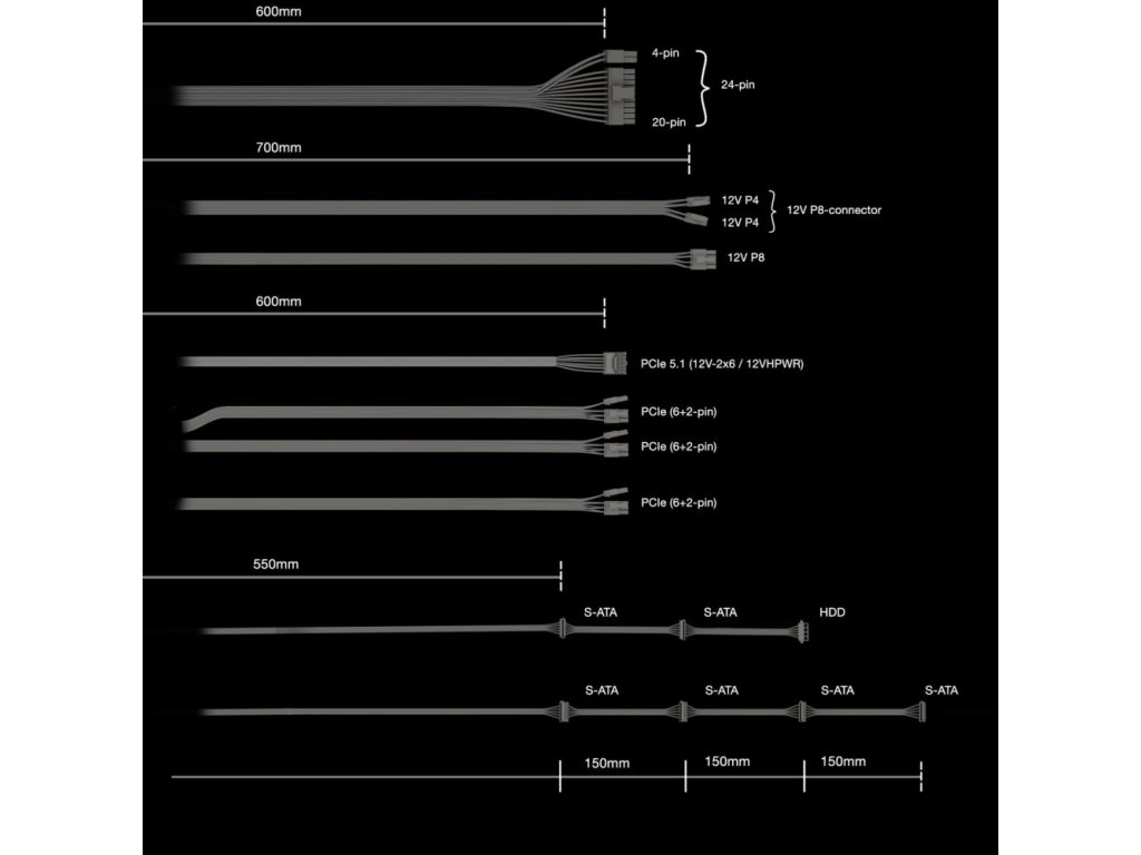 Napájecí konektory: 1× ATX 20+4pin, 1× PCIe 5.1 (600 W), 1× EPS 4+4pin, 1× EPS 8pin, 3× PCIe 6+2pin, 6× SATA, 1× Molex