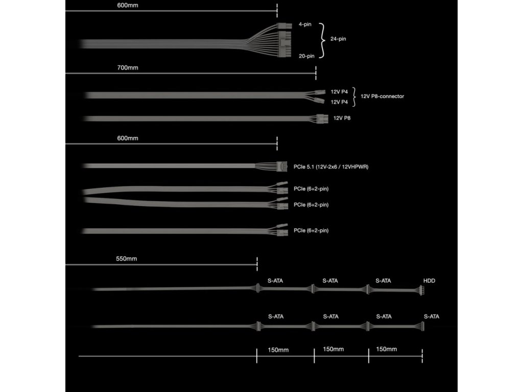 Napájecí konektory: 1× ATX 20+4pin, 1× PCIe 5.1 (600 W), 1× EPS 4+4pin, 1× EPS 8pin, 3× PCIe 6+2pin, 7× SATA, 1× Molex