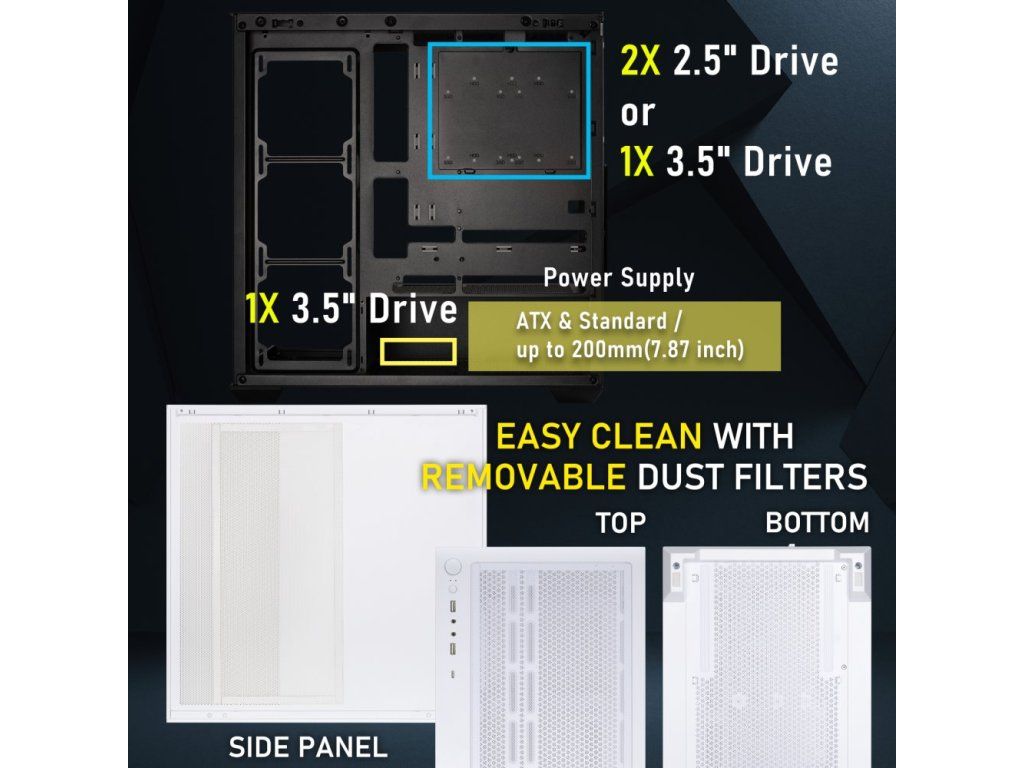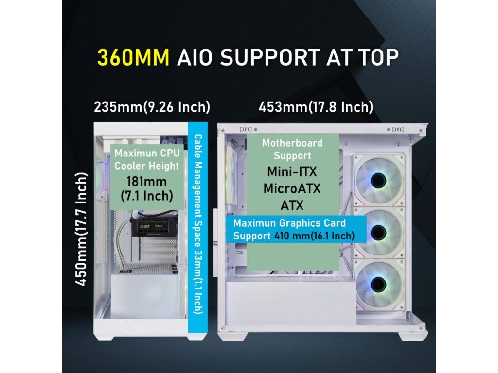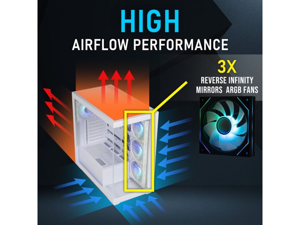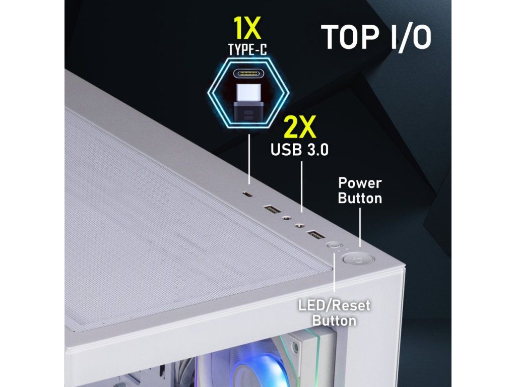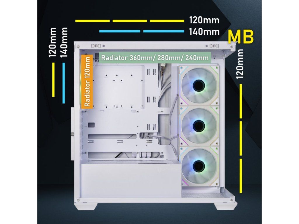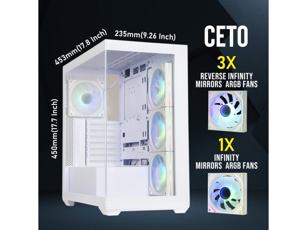 BitFenix CETO CubeHerní počítačová skříň nabízí stylovou prosklenou bočnici i přední panel a prvotřídní kovovou konstrukci. Skříň je osazena čtyřmi ventilátory o velikosti 120 mm s ARGB podsvícením a efektem nekonečného zrcadlení. Potěší také možnost rozšíření o další 3 ventilátory. Samozřejmostí jsou také prachové filtry. Důmyslné řešení umožňuje pohodlné umístění až 360 mm dlouhého výměníku vodního chlazení na horní straně. Ve skříni je dostatek prostoru pro chladič CPU do výšky až 181 mm a grafickou kartu o délce až 410 mm. Na horním panelu se nachází dva porty USB 3.0, jeden port USB-C, sluchátkový výstup a vstup pro mikrofon. Skříň je dodávána bez zdroje.