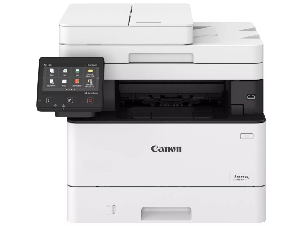 Canon i-SENSYS MF455dwMultifunkční černobílá laserová tiskárna formátu A4 nabízí rychlost tisku až 38 stran za minutu a rozlišení tisku 1200 x 1200 dpi. Disponuje vestavěným skenerem s rozlišením 600 x 600 dpi a rychlostí skenování až 38 stran za minutu. Vybavena je dvěma zásobníky papíru s celkovou kapacitou 350 listů. Potěší též automatický podavač dokumentů s kapacitou 50 listů a automatický duplexní tisk. Ovládání tiskárny je velmi snadné díky 5" dotykovému displeji a ovládacím prvkům na panelu. Připojení k počítači je realizováno skrze USB, ethernetový LAN port nebo bezdrátově pomocí Wi-Fi. Pro rychlý tisk z médií je připraven USB host port. Předností je také skenování a tisk z a do cloudového úložiště pomocí aplikace Canon PRINT Business. Tiskárnu lze také využít jako fax.