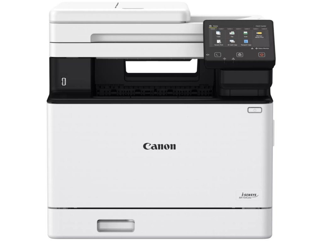 Canon i-SENSYS MF754CdwMultifunkční barevná laserová tiskárna formátu A4 nabízí rozlišení tisku 1200 x 1200 dpi při rychlosti až 33 stran za minutu černobíle i barevně. Disponuje vestavěným skenerem s rozlišením 600 x 600 dpi a rychlostí skenování až 50 stran za minutu. Vybavena je dvěma zásobníky papíru s celkovou kapacitou 300 listů. Potěší též automatický podavač dokumentů s kapacitou 50 listů a automatický duplexní tisk. Ovládání tiskárny je velmi snadné díky 5" dotykovému displeji a ovládacím prvkům na panelu. Připojení k počítači je realizováno skrze USB, ethernetový LAN port nebo bezdrátově pomocí Wi-Fi. Lze tak tisknout přímo z mobilního zařízení bez přístupu k firemní síti, odkudkoli v kanceláři. Pro rychlý tisk z médií je připraven USB host port. Předností je také skenování a tisk z a do cloudového úložiště pomocí aplikace Canon PRINT Business. Tiskárnu lze také využít jako fax.