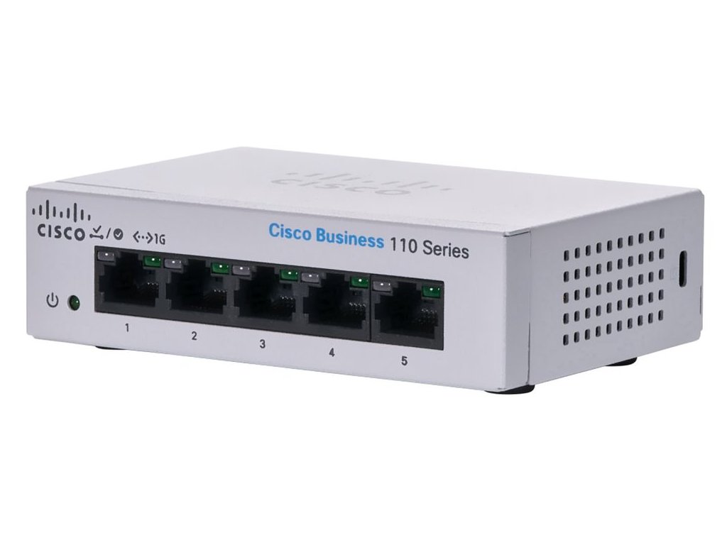 Cisco Business CBS110-5T-D-EUUnmanaged switch nabízející 5 portů GbE RJ-45. Přepínací kapacita switche je 10 Gbps a rychlost směrování činí 7,4 Mpps.
