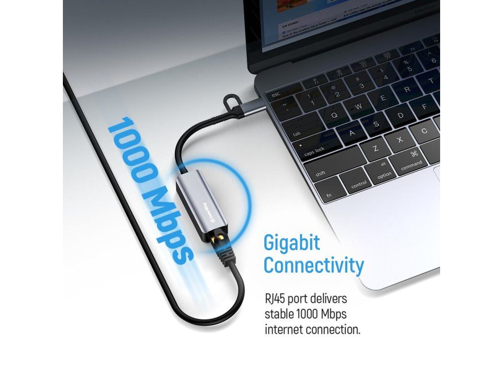 Univerzální síťový adaptér pro rychlé připojení k drátové síti přes USB nebo USB-C port.