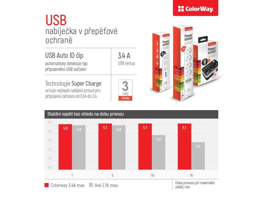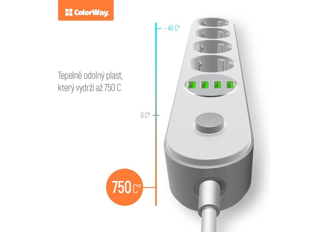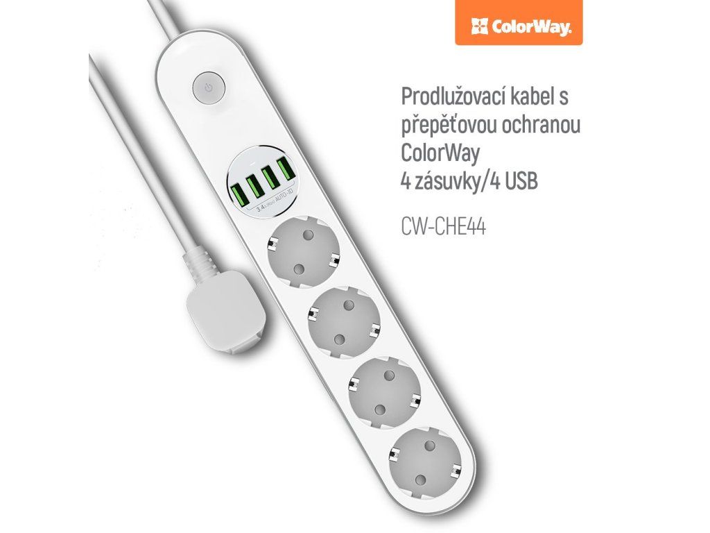ColorWay CW-CHE44WKompaktní prodlužovací přívod se čtyřmi síťovými zásuvkami 220 V a čtyřmi porty USB 5 V. Můžete s ním tedy připojit nejen elektrické spotřebiče, ale současně nabíjet až 4 mobilní zařízení z portu USB. Přívod také automaticky rozpozná typ připojeného zařízení a sám určí nejlepší nabíjecí proud připojeného zařízení od 0,1 do 2,4 A.