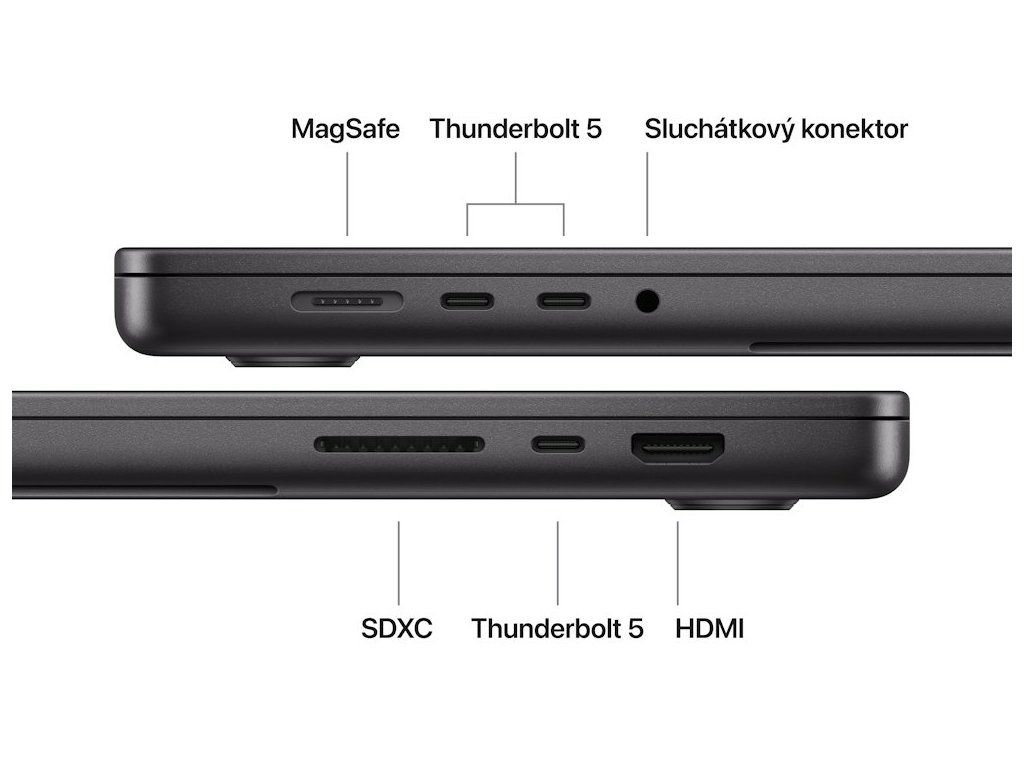 - Tři porty Thunderbolt 5 s přenosovou rychlostí až 120 Gb/s, port HDMI, SDXC slot a MagSafe 3 s rychlonabíjením