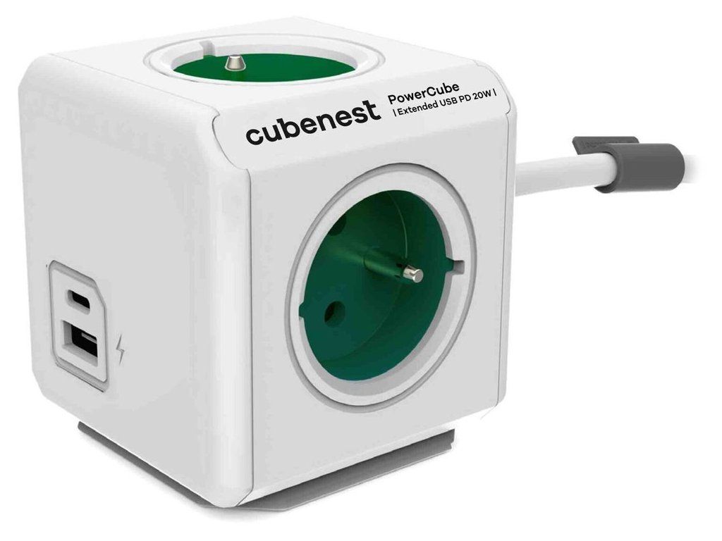 Cubenest PowerCube Extended USB PD 20 W 1,5 mCubenest PowerCube Extended je unikátní kombinací čtyř zásuvek, jednoho portu USB, jednoho USB-C a 1,5m prodlužovacího kabelu v kompaktním a stylovém těle pro nabíjení vašich zařízení. Technologie Power Delivery 3.0 nabízí inteligentní a rychlé nabíjení s automatickým přizpůsobením výkonu až do 20 W v režimech 5, 9 a 12 V. Promyšlené rozmístění zásuvek zajišťuje, že se nabíječky nebo objemné adaptéry navzájem neblokují. Samozřejmostí je tepelná, přepěťová, proudová a zkratová ochrana.