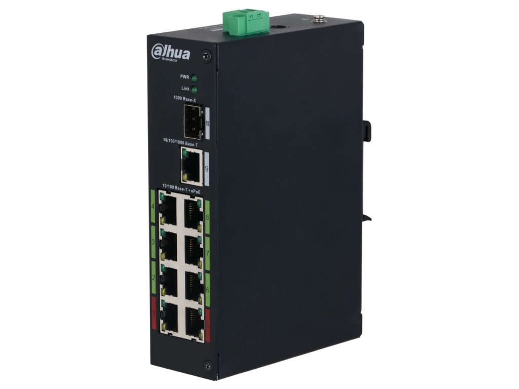 Dahua LR2110-8ET-120-V2Průmyslový 8portový ePoE 10/100 Base-TX L2 přepínač, včetně 1× 1000 Base-T a 1× SFP 1000 Base-X portů. Disponuje 8 Power over Ethernet injektory standardů IEEE 802.3af/at/bt + Hi-PoE, z toho 2 porty UltraPoE s napájením do 90 W, celkový napájecí výkon až 120 W.