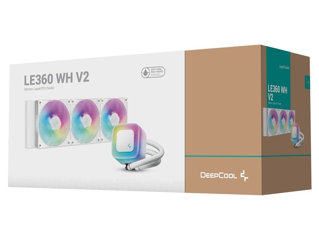 DEEPCOOL LE360 V2Vodní chladič určený pro chlazení široké škály procesorů. Vyznačuje se vysokou kvalitou, výkonem a spolehlivostí. Disponuje třemi 120 mm velkými ventilátory a pumpou s ARGB podsvícením. Odolné opletené hadice jsou dlouhé 410 mm a díky dostatečně širokému průměru zaručují plynulý průtok chladicí kapaliny.
