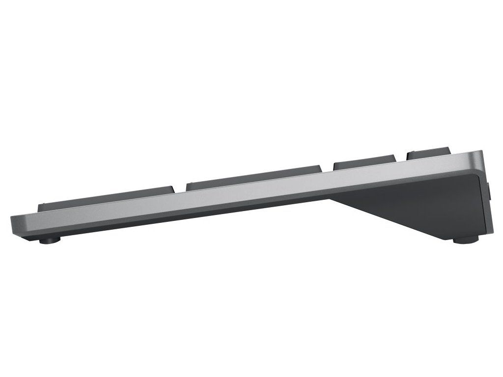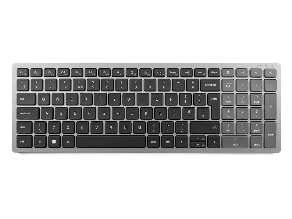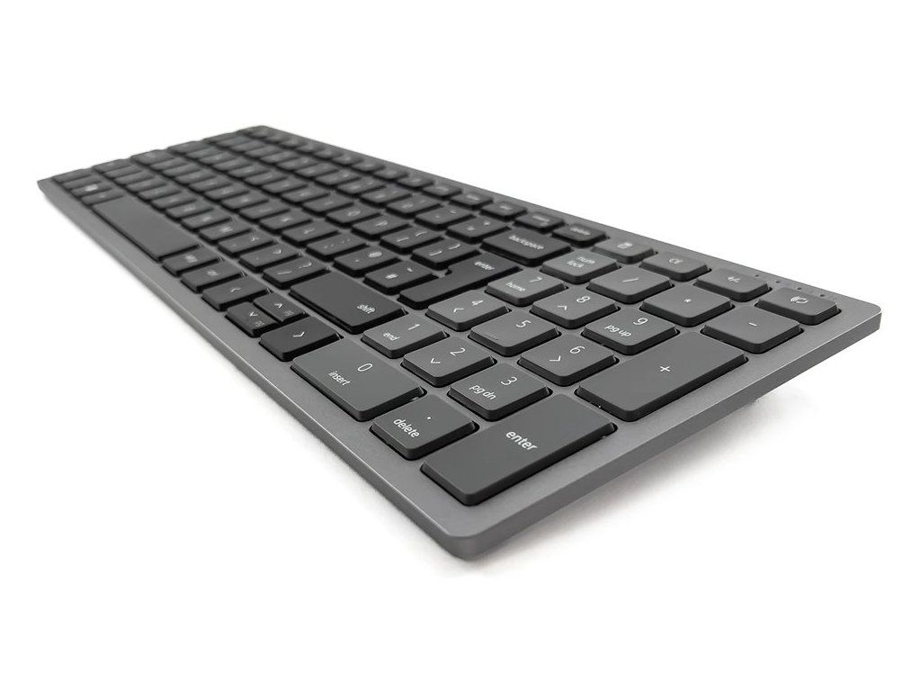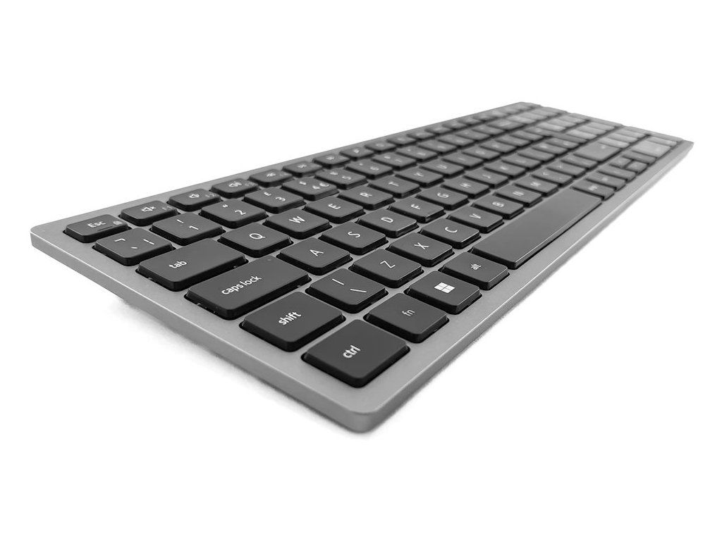 Stylová plnohodnotná bezdrátová klávesnice Dell podporuje připojení až ke třem zařízením v jeden moment. Napájení zajišťují dvě AA baterie, které zaručí výdrž až 36 měsíců. Připojení je realizováno bezdrátově skrze Bluetooth či miniaturní USB přijímač a technologii 2,4 GHz.