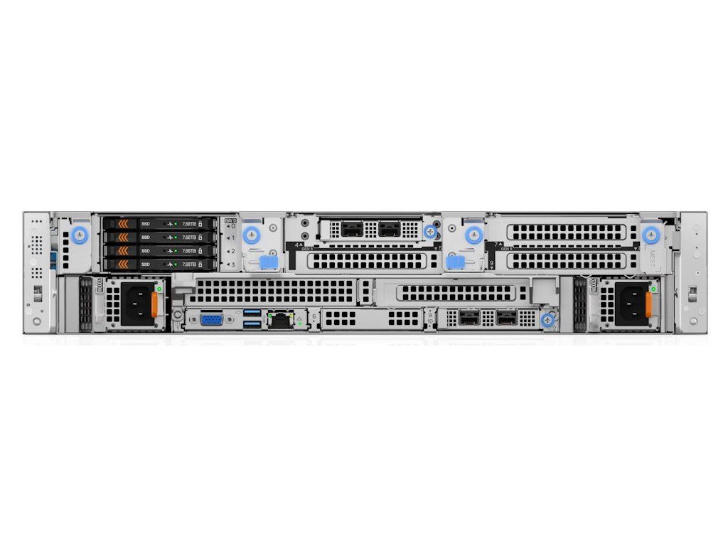 Server disponuje 32 GB DDR5 RAM s rychlostí 6400 MT/s a 960 GB SSD SATA diskem pro rychlý přístup k datům. Systém je vybaven pokročilým RAID kontrolérem PERC H965i pro ochranu dat a redundantními hot-swap zdroji 2× 1100 W s certifikací Titanium pro maximální spolehlivost a energetickou účinnost.