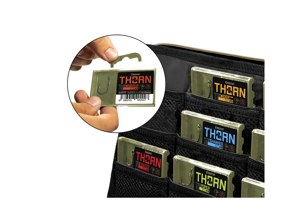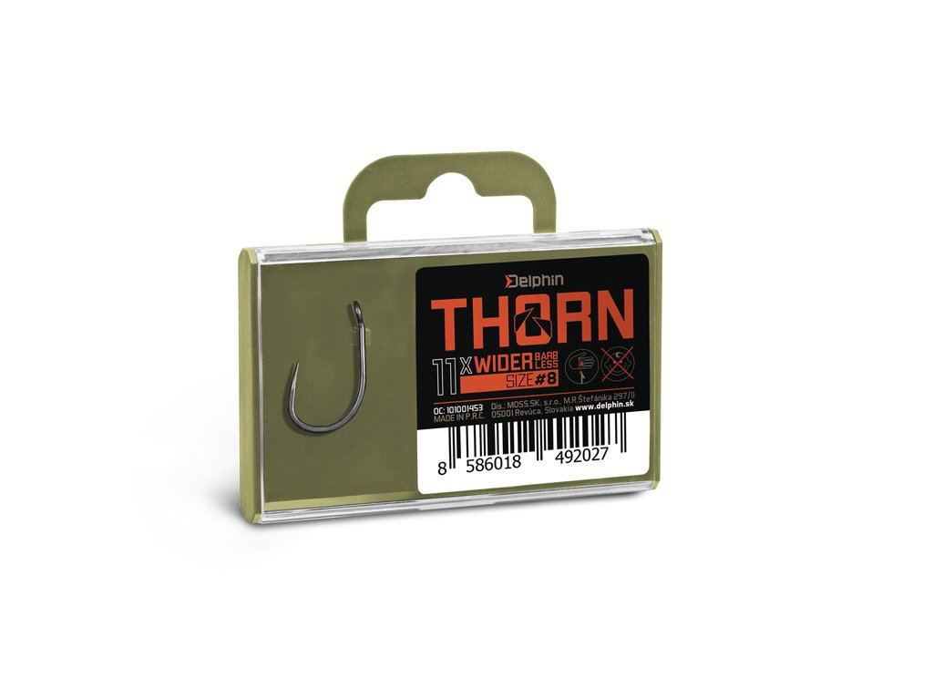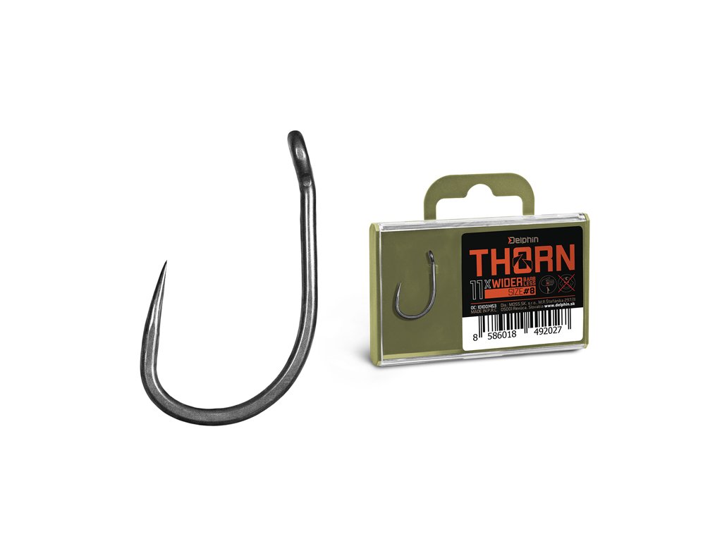 Delphin THORN je prémiová řada kaprařských háčků nejvyšší kvality. Díky moderním technologiím, které byly použity při výrobě jsou tyto háčky synonymem nekompromisní pevnosti a maximální ostrosti. Háčky ze série THORN disponují titanX povrchovou úpravou, čímž nabývají matný šedý povrch, který je navíc dokonale hladký pro snadné proniknutí do kapří tlamy. TitanX se stará také o zpevnění a odolnost celého háčku. Pomocí aplikované technologie Ultrapoint 4.8, bylo možné vytvořit delší hrot, který poskytuje přímo neuvěřitelnou ostrost. Háčky Delphin THORN jsou balené v praktické krabičce, ve které bude jejich ostří vždy důkladně chráněné. Na krabičce se navíc nachází držák s očkem pro zavěšení do prodejen, který lze snadno odstranit odlomením bez jakéhokoli nástroje díky čemuž krabička ve vaší výbavě zabere podstatně méně místa. THORN Wider BarbLESS je specifický svým přímo již legendárním tvarem typu wide gape. Jde o háček charakteristický širším obloukem a rovným ramínkem. Díky těmto parametrům jde o velmi univerzální a spolehlivý háček, který je možné využít při různých návazcích a nástrahách. V tomto případě háček nedisponuje protihrotem, díky čemuž pronikne do kapří tlamy mnohem snadněji. Technický parametr: háček osově rovnýDoplňkové parametry