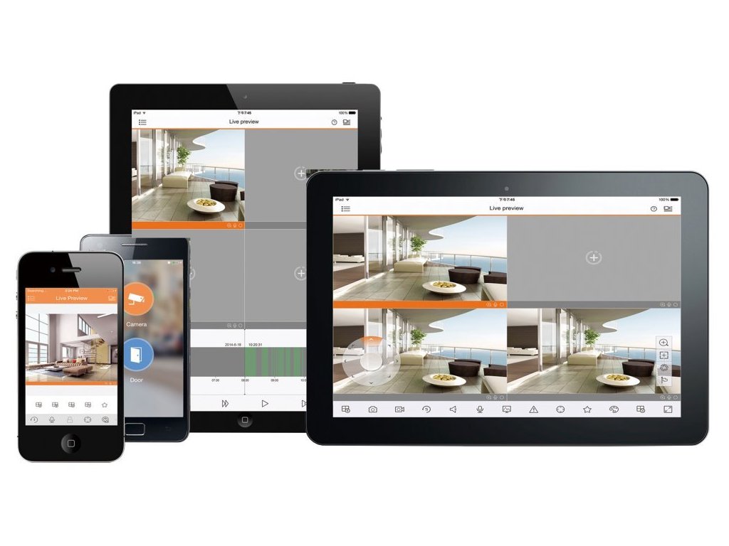 Mobilní aplikační řešení kamerového systému dovoluje sledovat IP kamery, DVR a NVR rekordéry, dveřní stanice. Stahujte a instalujte z aplikačních systémových bází (Google/Apple).