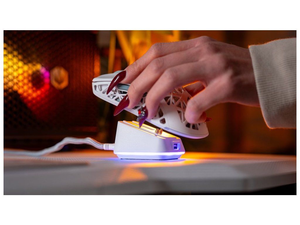 Elegantní bezdrátová nabíjecí stanice navržená jako ideální doplněk k myši LIV Wireless i LIV Plus Wireless. Díky bílému provedení s RGB podsvícením perfektně zapadne do každého herního nebo pracovního setupu a umožňuje pohodlné, rychlé nabíjení bez nutnosti připojování kabelů. Nabíjení začíná automaticky po přiložení myši na magnetickou základnu, a 11 režimů RGB podsvícení lze jednoduše měnit nebo úplně vypnout podle nálady. Stabilní gumová základna zajišťuje, že dock zůstane pevně na místě. Součástí je také USB 2.0 port pro připojení přijímače myši nebo jiného zařízení, čímž se zjednoduší kabeláž a sníží latence při používání.