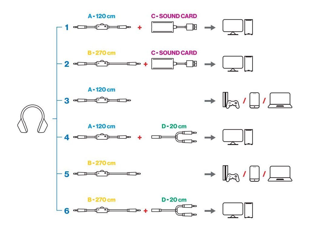 Součástí balení jsou náhradní textilní náušníky, dva kabely s konektory 3,5 mm jack (120 cm a 270 cm), krytka mikrofonního vstupu a redukce z combo jacku na dva samostatné výstupy pro mikrofon a sluchátka.
