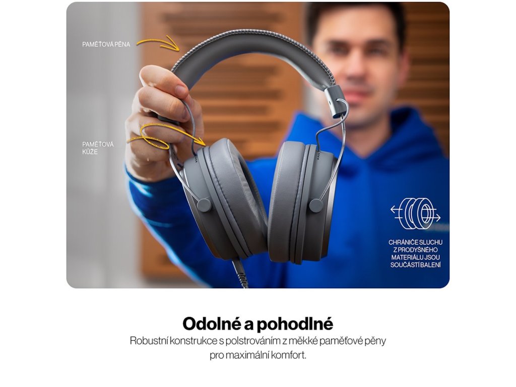 Ergonomický design a měkké polstrování zajišťují pohodlí i při hodinách hraní. Sada obsahuje náhradní pár náušníků z prodyšného materiálu, ideální pro teplejší dny nebo intenzivní používání.