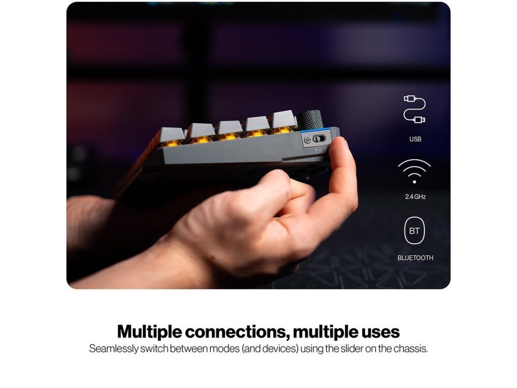 Druhá generace populární řady Thock přináší ještě větší pohodlí a univerzálnost díky trojímu způsobu připojení – Bluetooth, 2,4GHz bezdrátový přijímač nebo USB kabel. Klávesnice využívá exkluzivní lineární spínače Endorfy Yellow by Gateron s tovární lubrikací a podporuje hot-swap funkci pro snadnou výměnu spínačů za provozu.