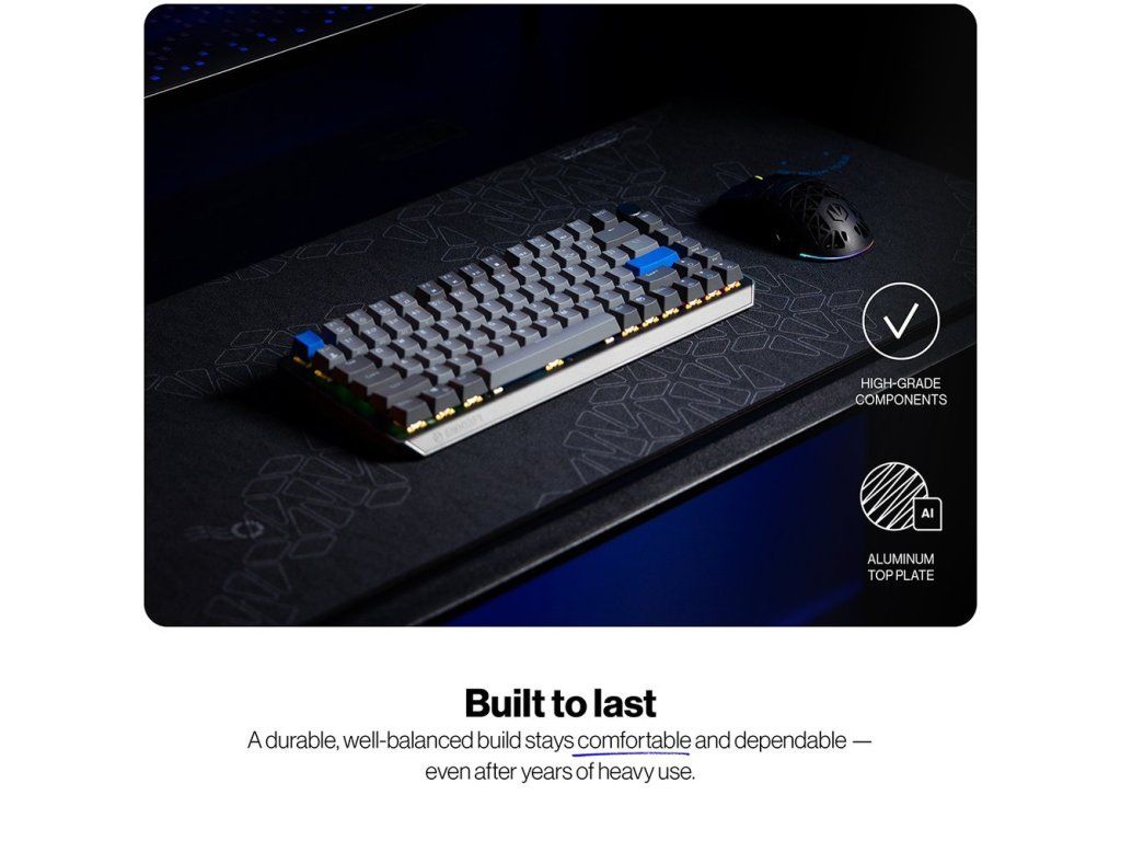 Prémiová konstrukce s hliníkovou horní deskou a třemi vrstvami akustické pěny (dvě PORON + jedna IXPE) zajišťuje odolnost, stabilitu a vyladěnou akustiku. Kompaktní 82klávesové rozložení s ARGB podsvícením a pokročilým softwarem pro přizpůsobení činí z této klávesnice ideální volbu pro práci i hraní.