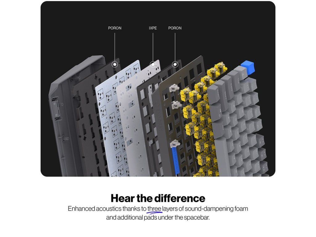 Speciálně vyladěná akustika využívá tři vrstvy pěnového tlumení pro minimalizaci ozvěny. I mezerník je odhlučen silikonovými podložkami, takže každý úhoz zní čistě a uspokojivě.