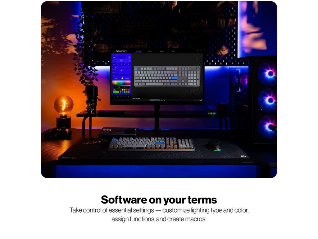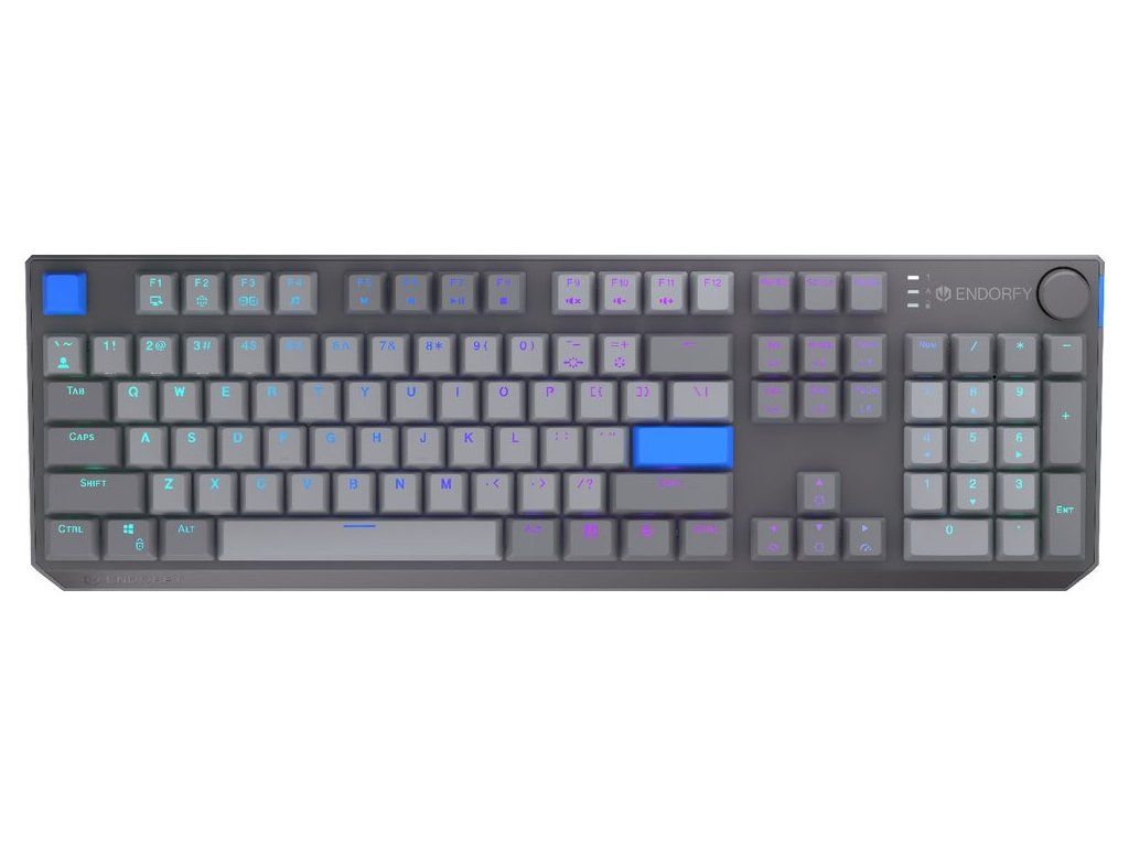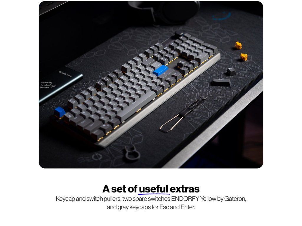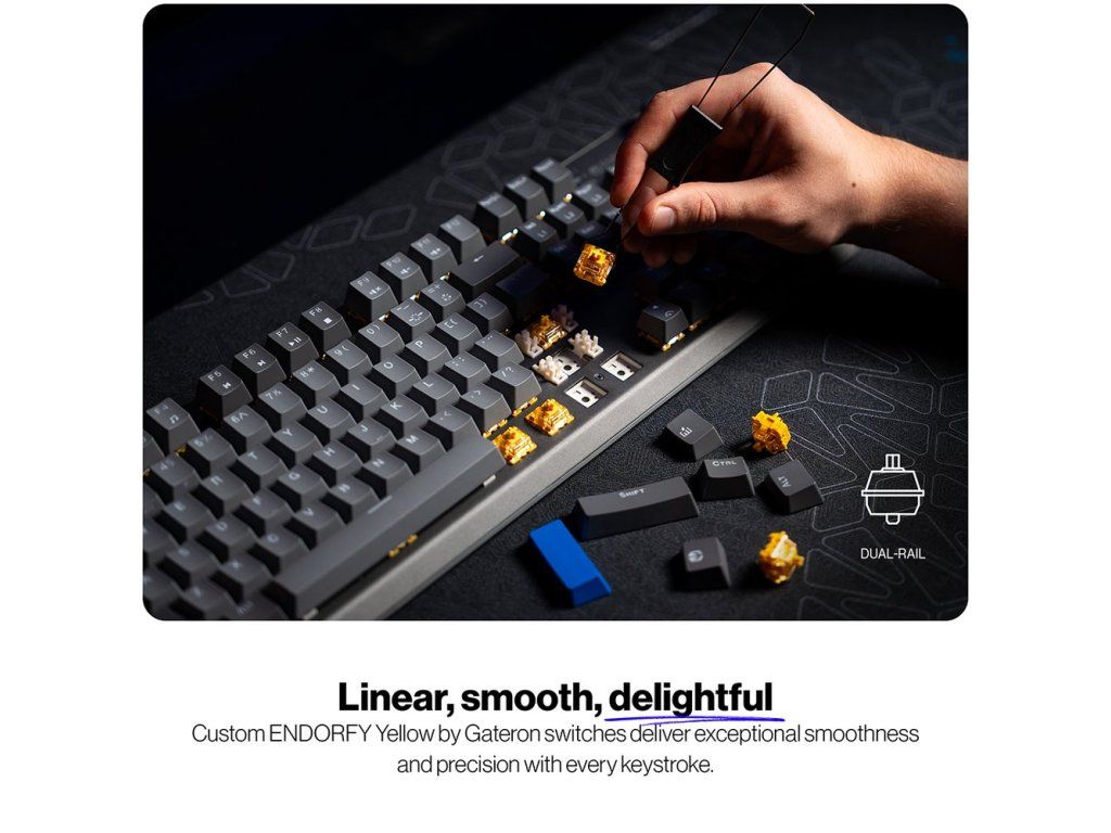 - Proprietární lineární spínače Endorfy Yellow by Gateron s továrně lubrikovanou konstrukcí a dvojitou kolejnicí