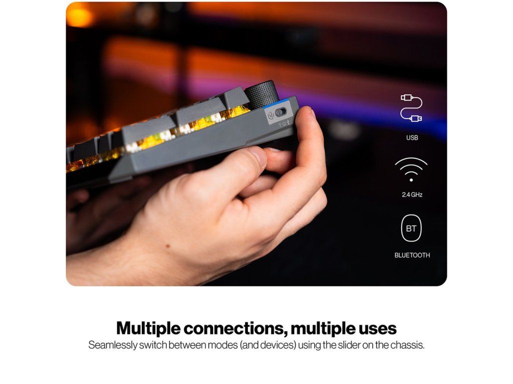 Nová generace bezdrátových mechanických klávesnic byla přepracována pro maximální pohodlí a univerzálnost. Klávesnice nabízí plnohodnotné rozložení US ANSI se 104 klávesami a umožňuje připojení přes Bluetooth, 2,4GHz bezdrátový přijímač nebo USB kabel s možností snadného přepínání mezi zařízeními.