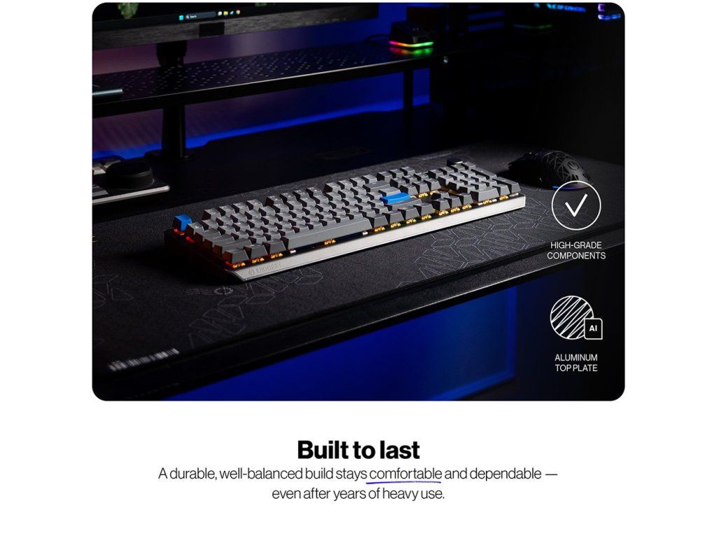 Konstrukce využívá prémiové materiály vyztužené pevnou hliníkovou horní deskou pro dlouhodobou odolnost. Speciální akustické řešení s třemi vrstvami pěny (dvě PORON a jedna IXPE) minimalizuje ozvěnu a eliminuje dutý zvuk při psaní. I mezerník je odhlučen silikonovými podložkami pro čistý a uspokojivý zvuk každého úhozu.
